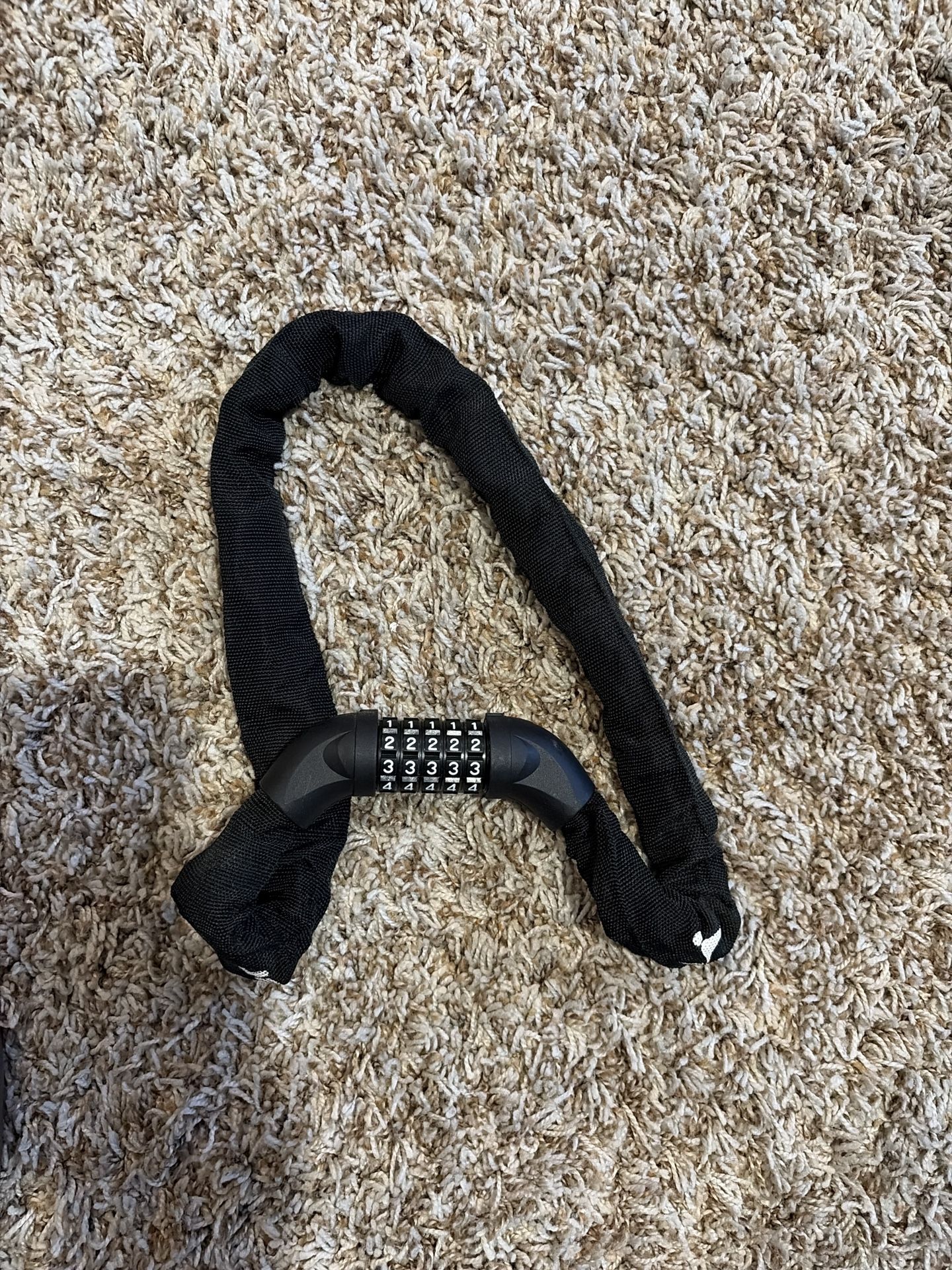 bike new chain lock, only used 1–2 times. • 5-digit combination (no key needed) • Strong, heavy-duty chain • Protective fabric cover (prevents scratches) • Great for bikes, scooters, or gates Condition: Excellent, almost new Works perfectly, combination will be reset before pickup Pickup only