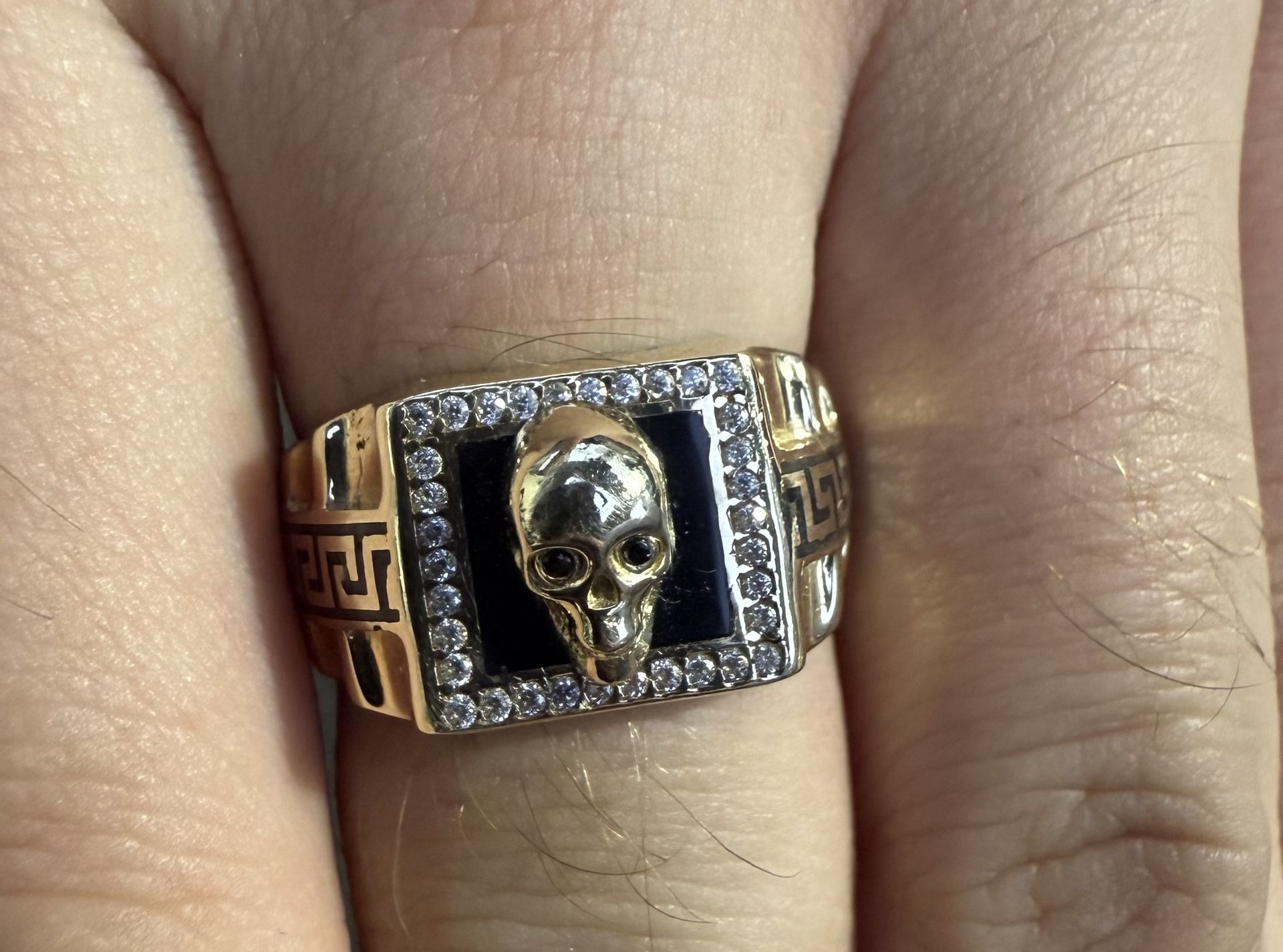 Own a ring that commands attention. This solid 10K gold men’s ring features a striking skull centerpiece framed by shimmering stones and detailed black Greek key inlays along the band. Weighing 4.67 grams, it blends bold style with real gold value. • Genuine 10K Gold – Stamped and tested • Weight: 4.67 grams • Design: Skull face surrounded by CZ stones + detailed engraved sides • Condition: Gently worn, professionally cleaned • Perfect for: Statement wear, collectors, or anyone who leads with presence