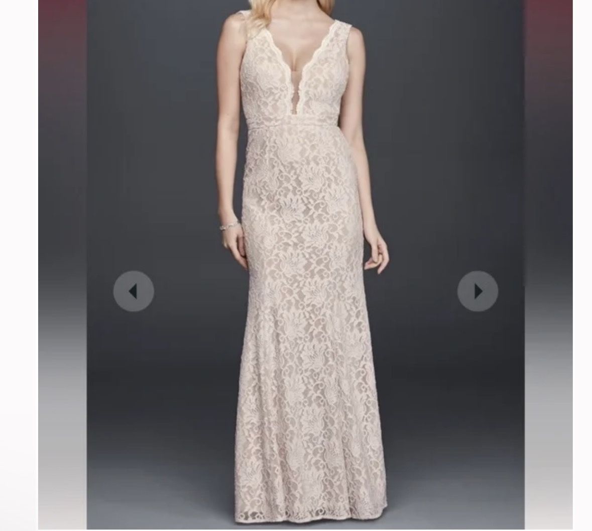 Like new David's Bridal Ivory Nude Lace Plunging V-Neck Wedding Gown size 8. This stunning cream lace evening gown is perfect for any formal occasion.