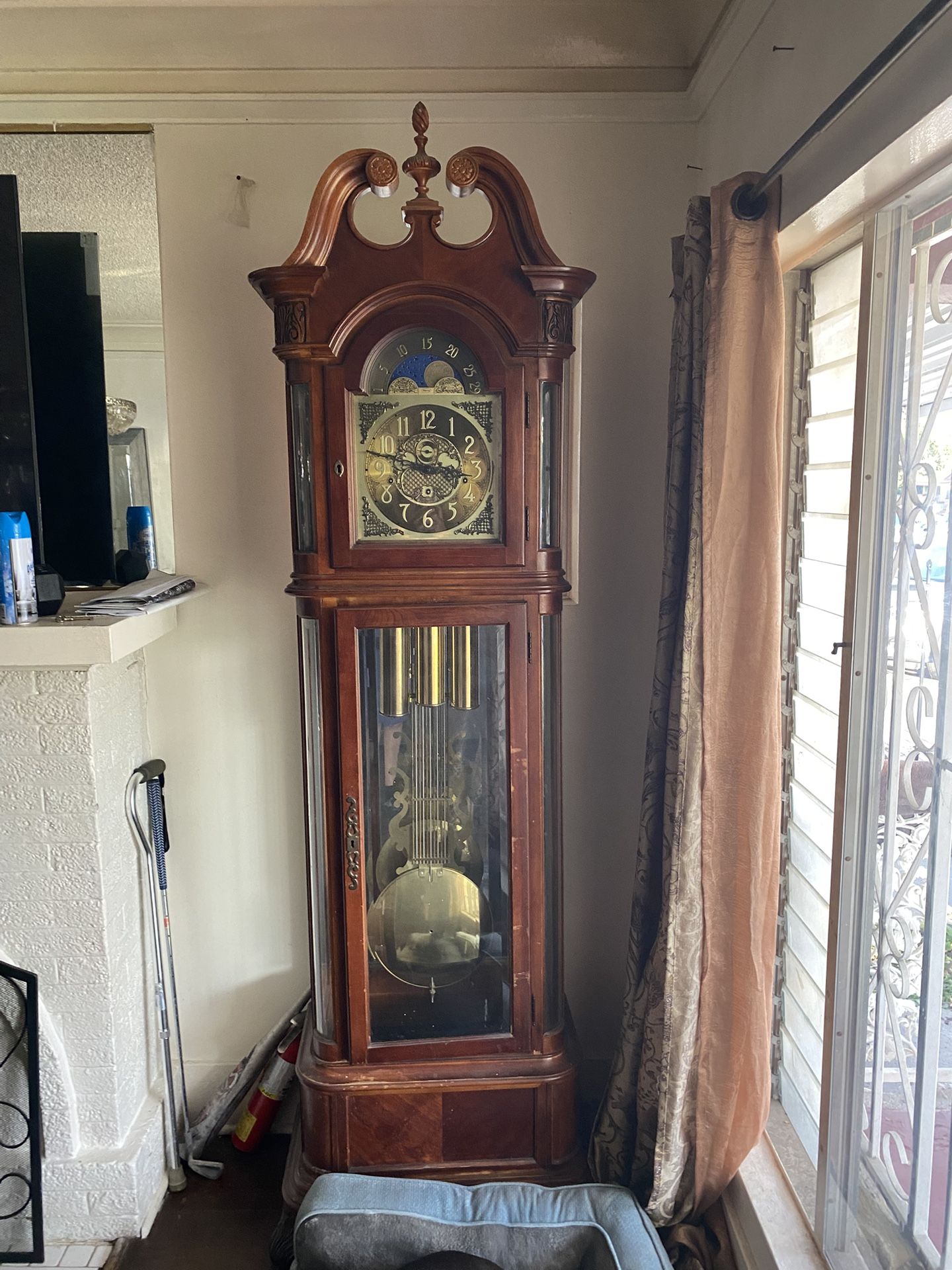 For sale is a beautiful, classic grandfather clock in a rich wood finish (likely cherry or mahogany). This is a mechanical, weight-driven clock that makes a stately addition to any home. Features: Moon Phase Dial: Functional rolling moon dial that tracks the lunar cycle. Triple-Weight Movement: Features three polished brass weights and a large lyre pendulum. Chimes: Traditional Westminster chimes (hourly and quarter-hourly) with a silent mode option. Design: Elegant split-pediment top with a decorative center finial and crystal-clear glass locking door. Condition: Cabinet is in excellent physical shape with no major scratches or dents. Mechanical works are intact. Dimensions (Approximate): Height: 78" – 82" (Standard Floor Clock Height) Width: 20" Depth: 12"