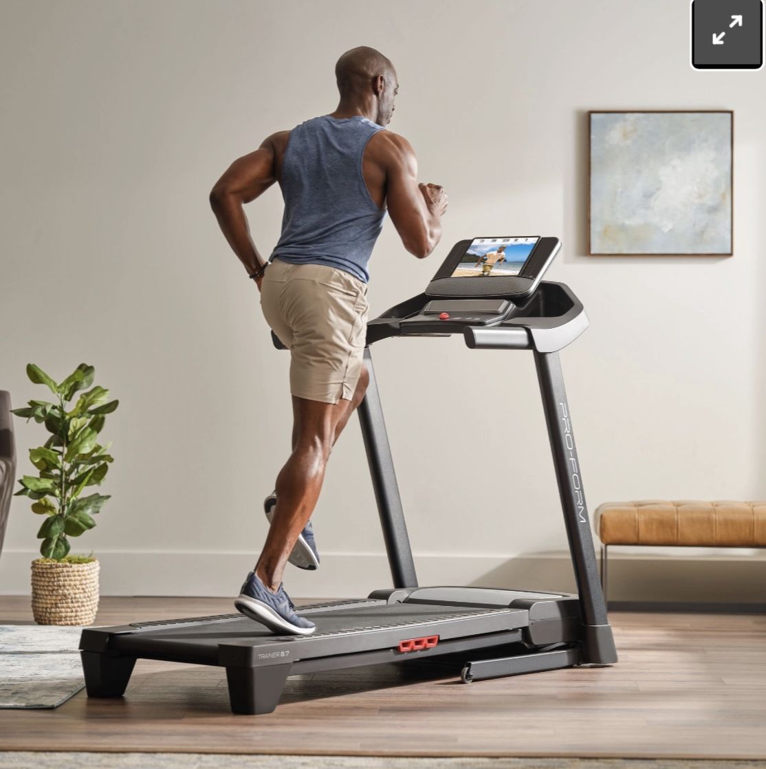 We just received this treadmill in today. It is brand new and takes up hardly any room. If you are looking to get in shape or stay in shape this is for you! Retail is over $1000 with tax!!! ProForm® Trainer 8.7 Treadmill Features: · 7” High Contrast Display · 2.75 CHP Motor · 20”x55” Tread Belt · SpaceSaver® Design with Easy Lift Assist · 0-12 MPH · 0-10% Incline · iFIT Enabled, 30 Day Family Membership Included