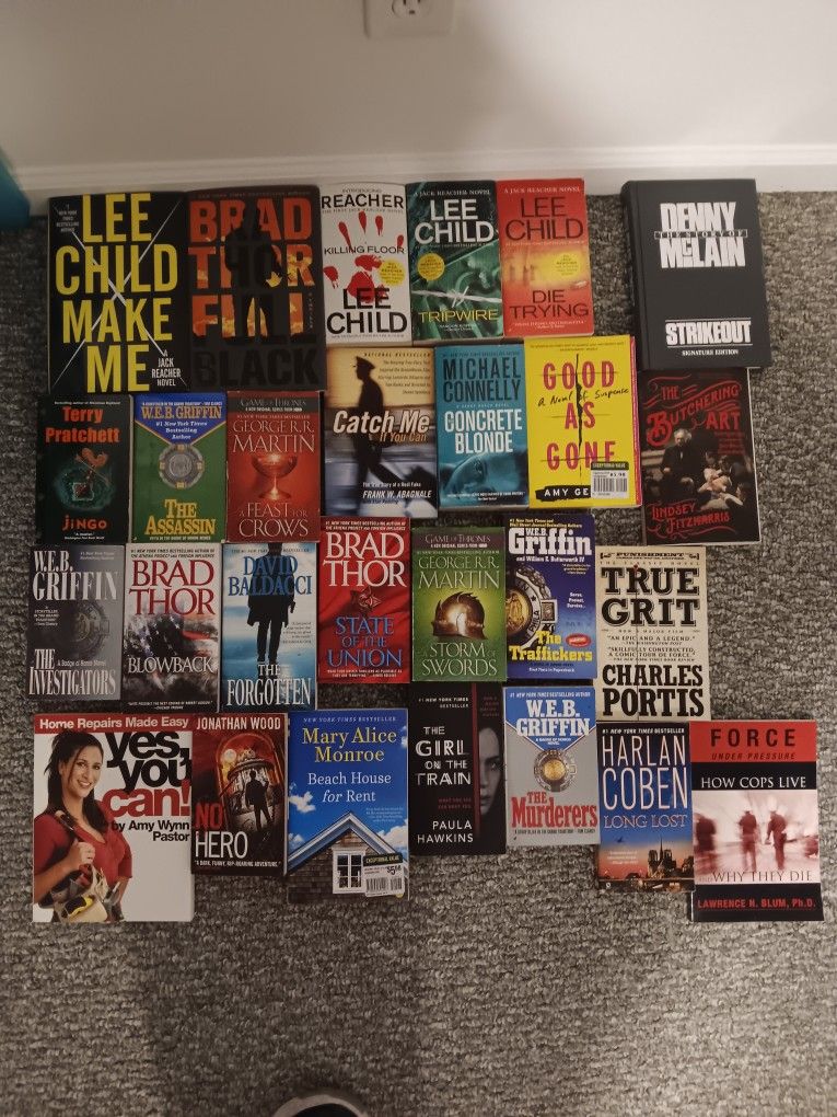 Make me by Lee child Full black by Brad Thor Introducing Reacher Killing Floor by Lee Child Trip wire by Lee Child Die Trying by Lee Child Strikeout by Denny Mclain Jingo by Terry Pritchet The Assassin by w.e.b. griffin A feast for crows by George r.r. martin Catch me if you can by frank w. Abagnale Concrete Blonde by Michael Connelly Good as gone by amy gentry The butchering art by lindsey fitzharris The investigators by w.e.b. griffin Blowback by Brad thor The forgotten by David baldacci State of the union by Brad Thor A storm of winds by george r.r. martin The traffickers by w.e.b. Griffin True grit by charles portis Yes you can by amy wynn pastor No hero by jonathon wood Beach house for rent by mary alice monroe The girl on the train by paula hawkins The murderers by w.e.b. griffin Long lost by harlan coben Force under pressure how cops live and why they die by lawrence n. Blum