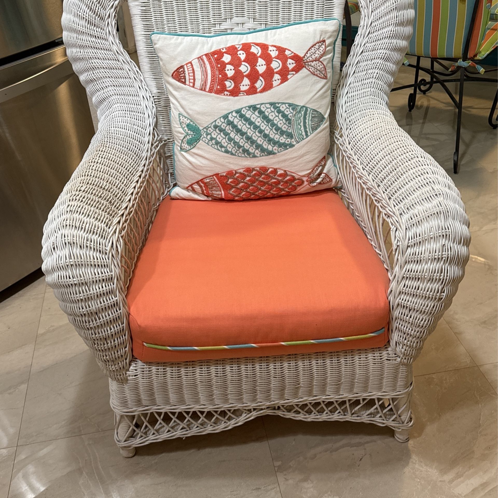 The white wicker chair was bought at the Lemon Tree. The cushion was just recovered within the year. 32” wide, 26” arm rest , 30” deep and the back 42”. The seating area is 19”x 23”. The chairs in great shape and the cushion is perfect.