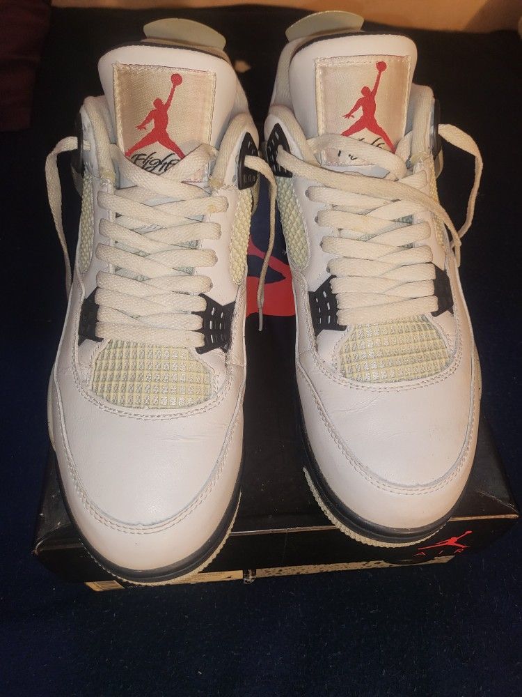 Good condition size 10, Jordan 4 cement, it does carry one flaw where on the left shoe, the lower inner lace holder (the black thing lol lower inside right shoe) broke off, I have glued it back on (happen a while back) it hasn't moved at all, comes with box , I have had them for a while and they are in really good condition