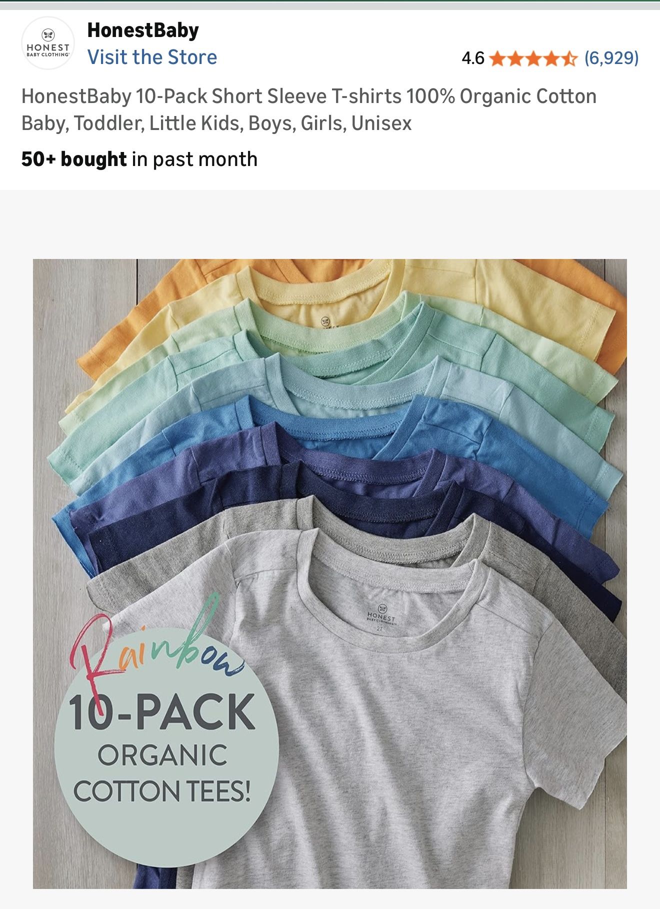 New With Tags, HonestBaby 10-Pack Short Sleeve T-shirts, 4T, 100% Organic Cotton Baby, Toddler, Boys, Girls, Unisex