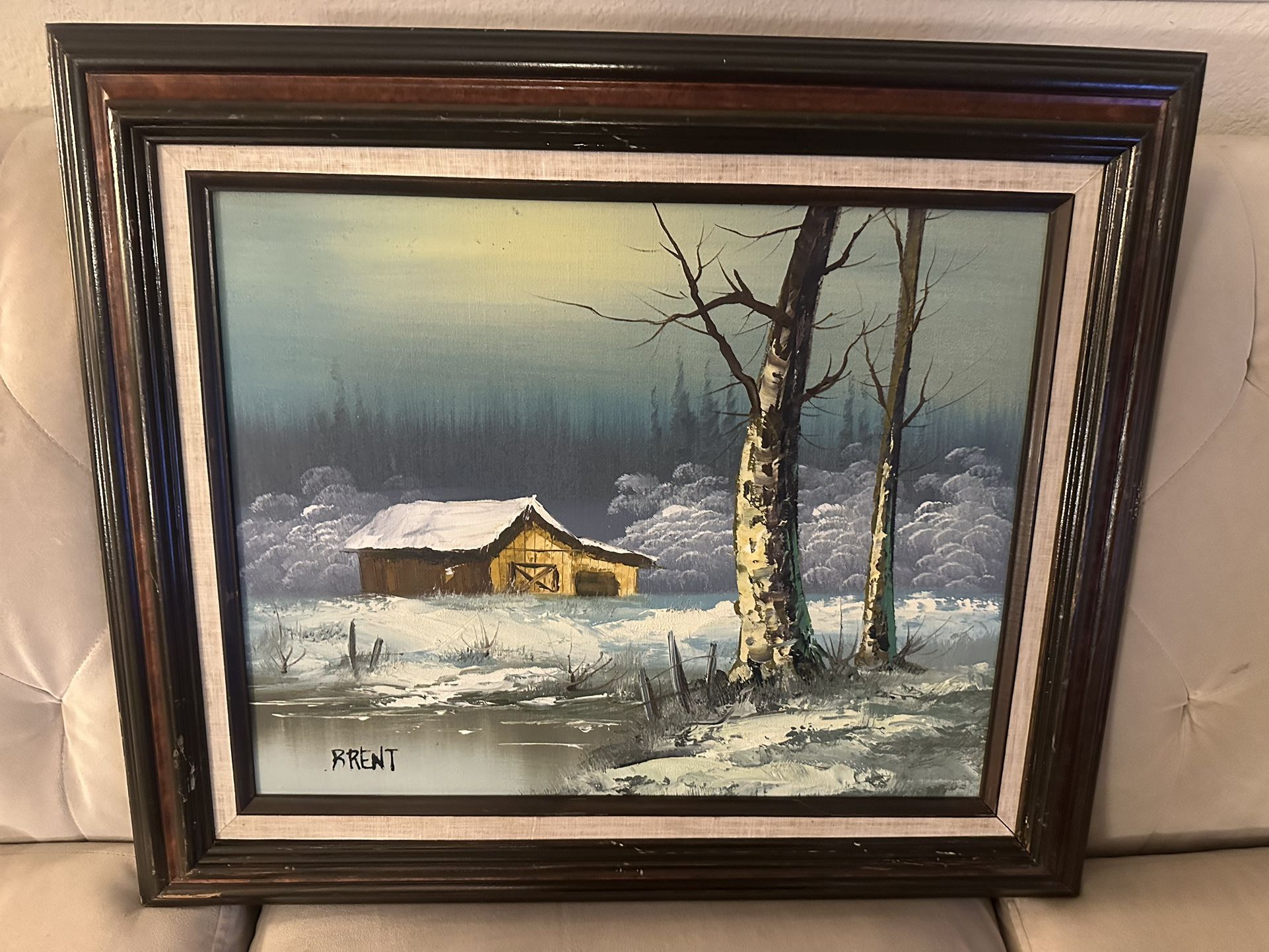 The product is a vintage oil painting of a winter snow cabin landscape, signed by the artist. The painting is framed and ready to hang, adding to its authenticity and display value. Perfect for art enthusiasts looking to add a unique and rustic piece to their collection, the oil painting captures the beauty and tranquility of a winter scene in a charming cabin setting.