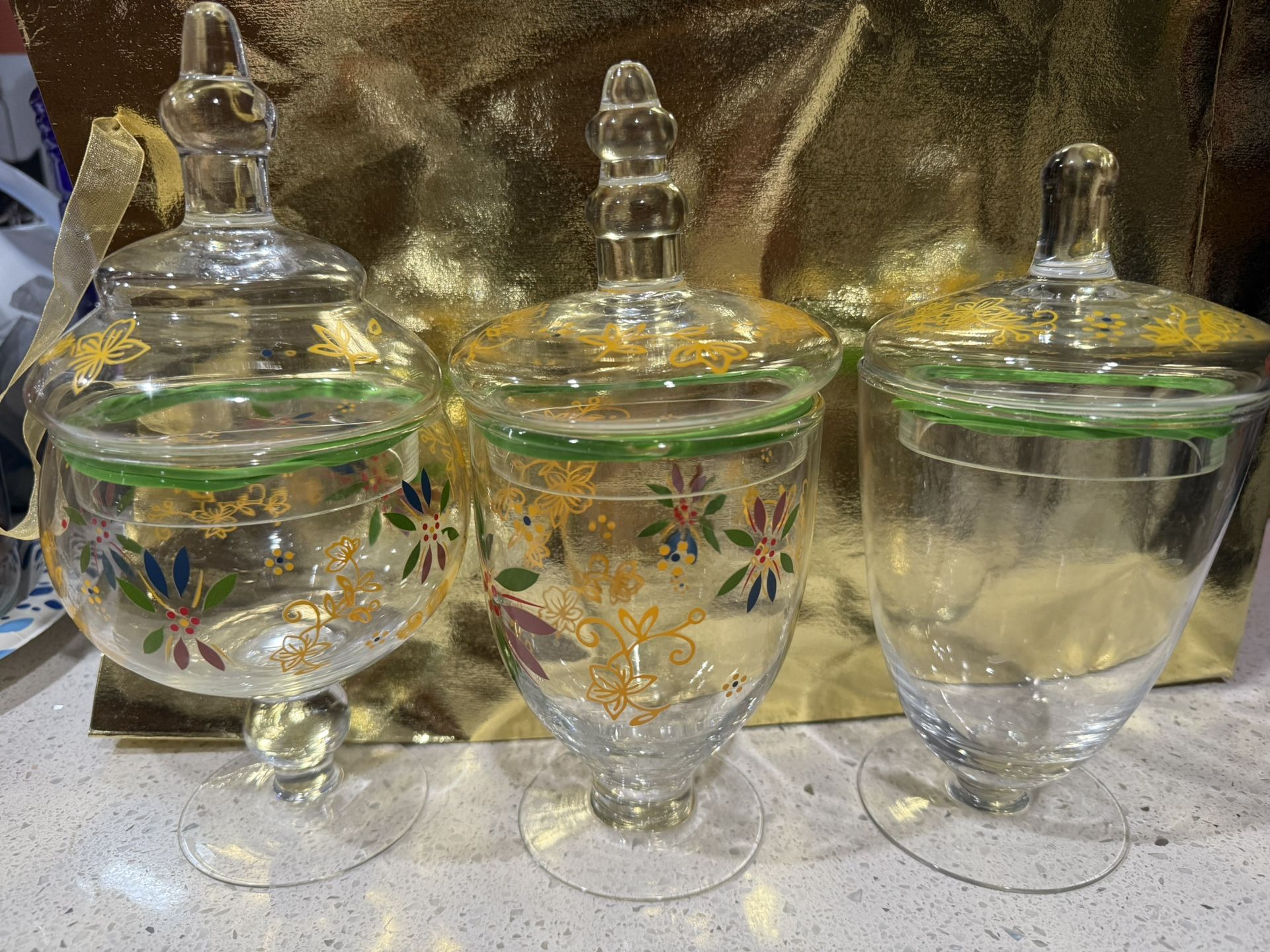 $15.3pc Fine Glass Jars. $45.Obo. Big Glass With Top Glass Decor ((Carry Prescription Clear Contacts))