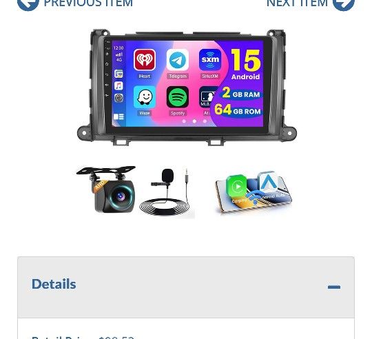 Lot # UB4207: 264GB Android 15 Car Stereo for Toyota Sienna (contact info removed)4 Wireless Carplay 9 Touch Screen Car Radio Android Auto GPS Navi WiFi Bluetooth Audio Receiver SWC Backup Camera FM RDS Radio