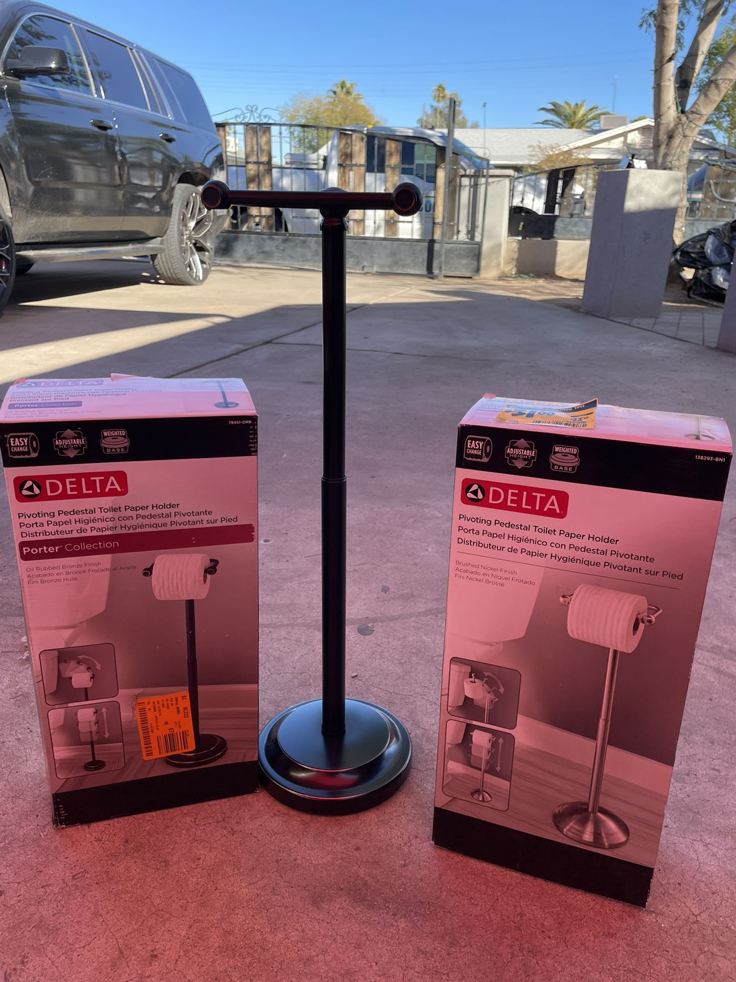 New $20 We have all colors Bold oil rubbed bronze finish brings warm tones to the bath Freestanding design allows for versatility Casual traditional design coordinates with most decors Model#: 78451-ORB Sku#: 1001399883 Internet#: (contact info removed)28 The tapered curves and graceful arcs of the Delta Porter Bath Collection are reminiscent of classic architectural forms. The Delta Porter telescoping freestanding pedestal toilet paper holder is a perfect fit for any home with its blend of casual and traditional design elements. Give your bathroom an updated, refreshed look with coordinating faucet, shower head and bathroom accessory options (sold separately). Adjustable for your ideal height for easy access Rustic oil rubbed bronze brings old-warm charm to you space for an inviting, sophisticated look in a stunning combination of deep, warm tones and hand-relieved bronze highlights for a truly unique look Has durable, long-lasting finish to help prevent corrosion, tarnish or discolor, so you can enjoy a look you love for life Zinc die cast construction provides reliability and durability Pedestal feature allows for movement and perfect placement in your bathroom Complementary Delta porter bath accessories available Simply twist and lock when using the telescoping feature to ensure the tissue holder stays in place No tools needed, simply assemble and use Beautifully coordinates with Delta porter faucet