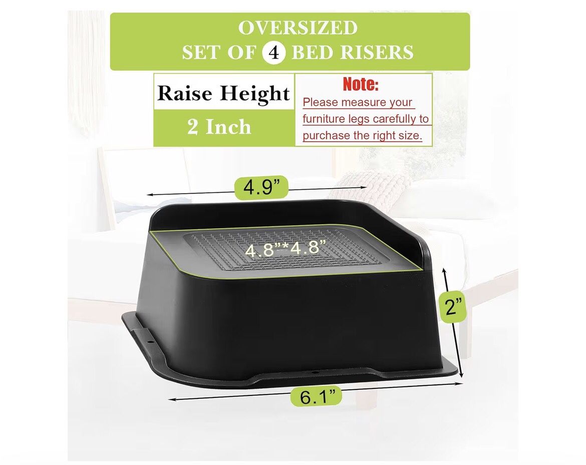 New never been used. Bed And Furniture Risers; 2 Inch, box Of 4. Heavy Duty. Oversize furniture, riser for couch, sofa, table chair, leg frame, door bed, support up to 6000 pounds Black. Retails for $17.96 on Amazon. Cash Only Please
