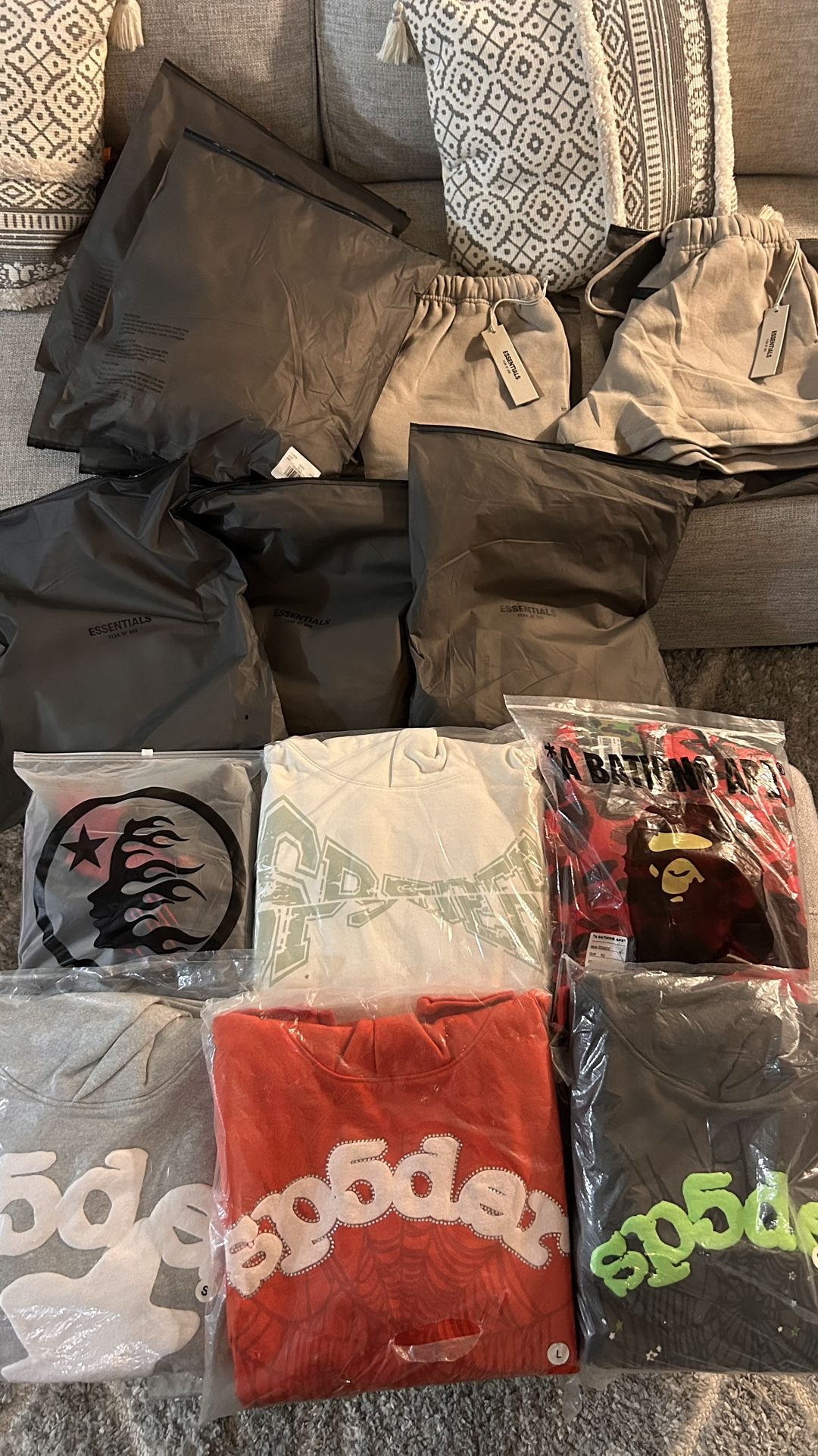 Hellstar tee- Medium Text me for sp5der BAPE- Large Essentials shorts- XS-L