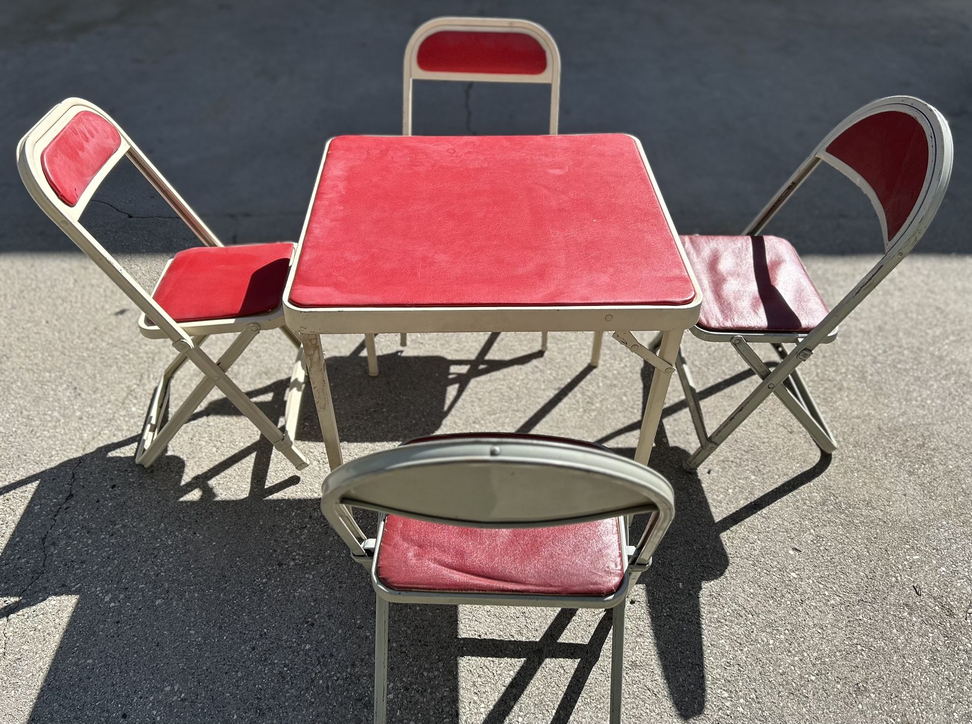 Vintage metal children’s table and four chairs. One chair has a tear in the upholstery.