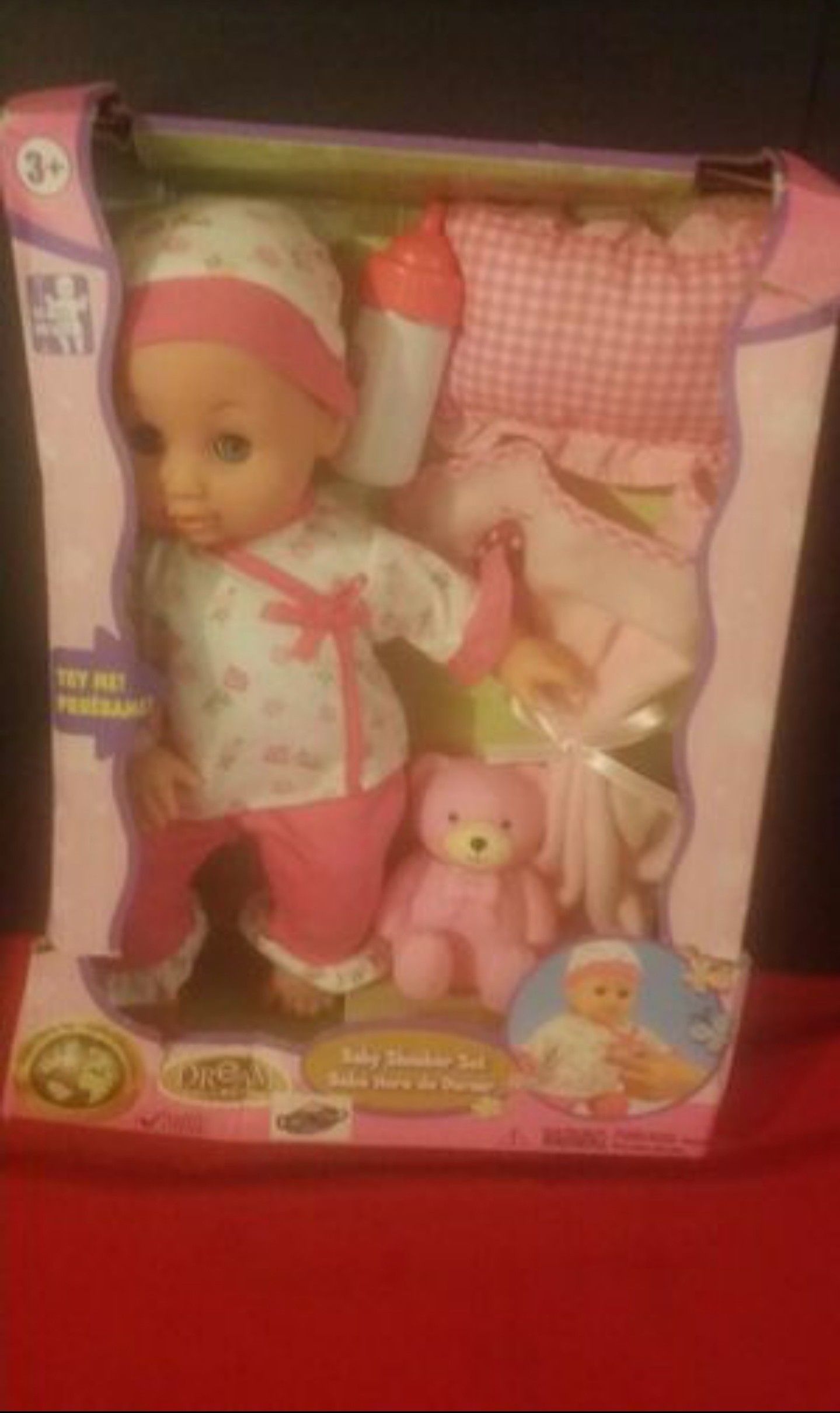 Baby Slumber Set...comes with: -the baby eyes open & close... press the belly and she laughs, slurp, cry and babbles. -the pajamas on the baby -bottle -little pillow -little blanket -plastic teddy bear Still in original package. Box a little tip on side.