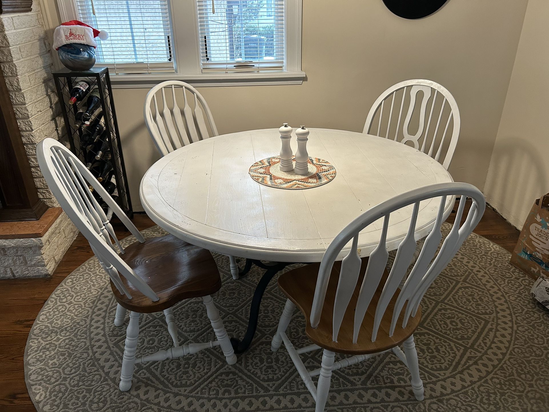 Excellent small dining set with painted top. The only issue is the top paint has chipped in places so could use a touchup. The chairs are in great condition and the table structurally is excellent. Everything is very heavy with high quality materials. 52” diameter and 32.5” high.