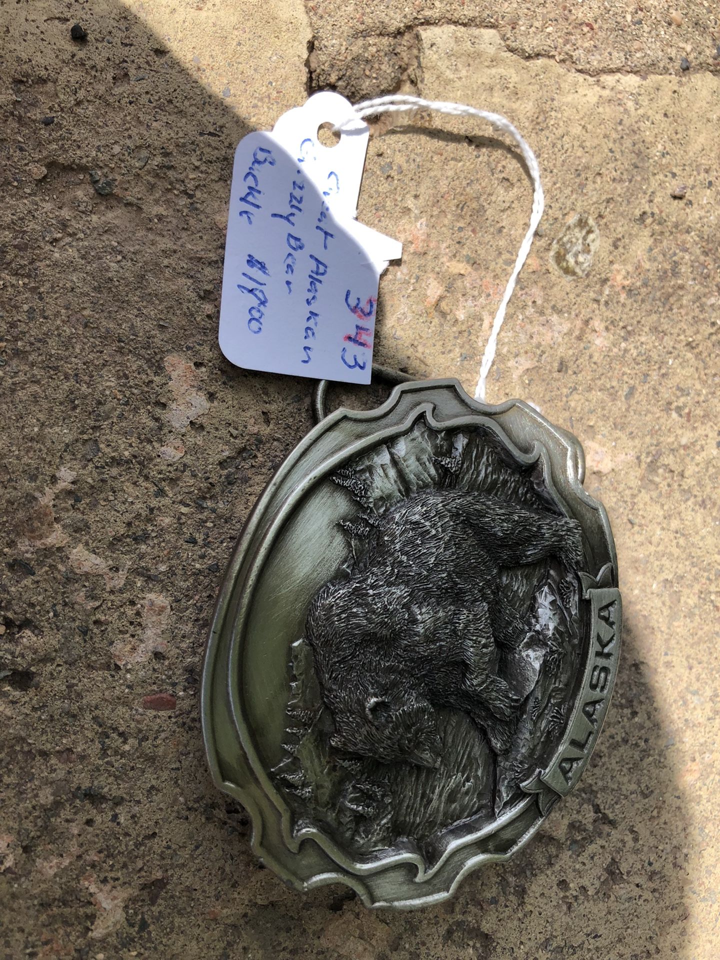 Real well kept Alaskan metal belt buckle with great detail available at Glass Booth # 55 at merchant square Antique store on Arizona Ave in Chandler. Currently this item was named as a classic creation! The store opens at 10:00.There is a discount on Tuesday. Note there are several other classic belt buckles in my case