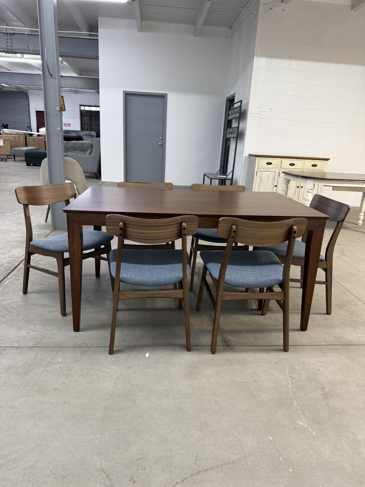 Rectangular Dining Table Set (7 Pieces) Walnut Color with Upholstered Blue Cushions. ““Brand New Set”” Table Dimensions: L35 1/2” x W35 1/2” x H29 7/8” Chair Dimensions: L19” x W22 1/2” x H31 1/2” Please Read Below, We are willing to negotiate all our items and prices, No Returns or Refunds, Message me for availability or more information, and be ready to pick up as soon as you get confirmation a item is still available. Items are first come first serve, as we host furniture sales frequently!!