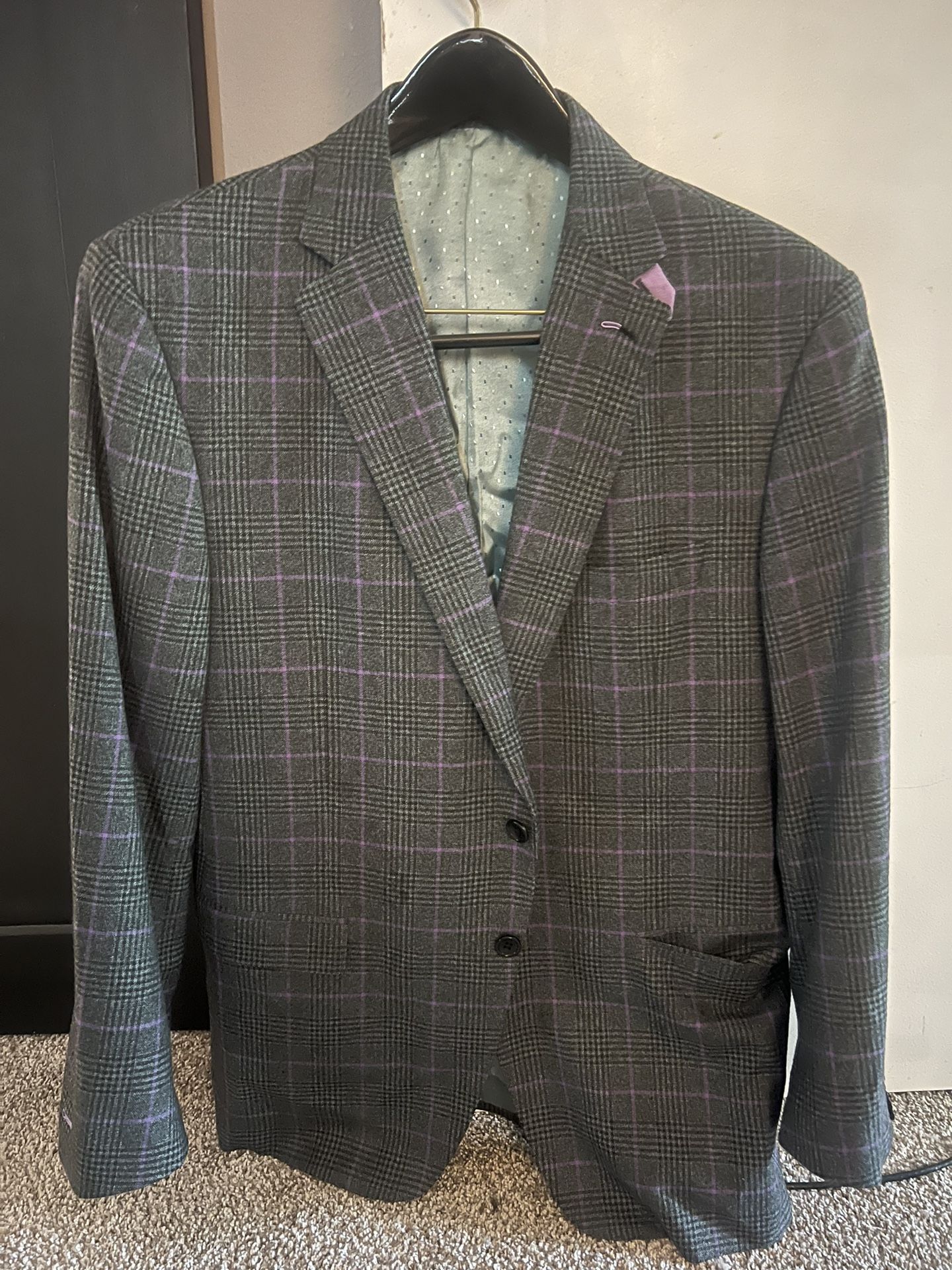 Selling a beautiful custom 100% wool men’s blazer in excellent condition. Gray with purple windowpane pattern — super sharp, modern, and unique. Originally around $900 when custom-made. Letting it go for $50 for a fast sale. ✅ Details • 100% Wool (premium feel) • Full lining (100% Viscose) • Custom clothier quality • Crisp pattern with contrast stitching • No stains, no rips, no issues • Smoke-free home • Fits similar to a 42R depending on body type This is NOT a cheap suit jacket — the wool quality and tailoring are top tier. I just need to move it fast.