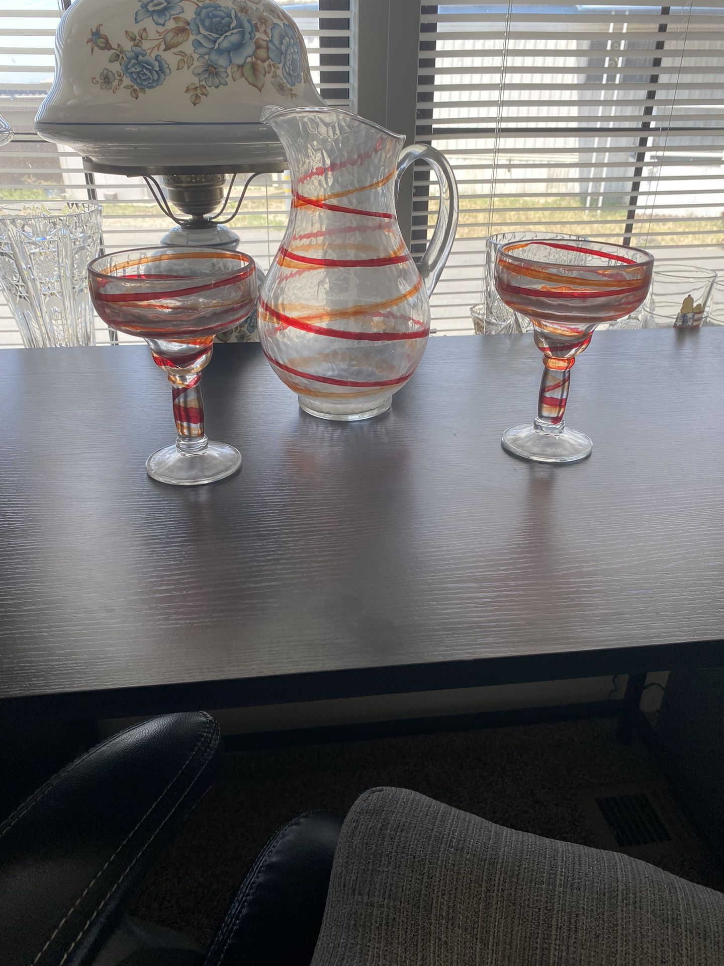 Blown glass pitcher with two glasses Hand blown glass