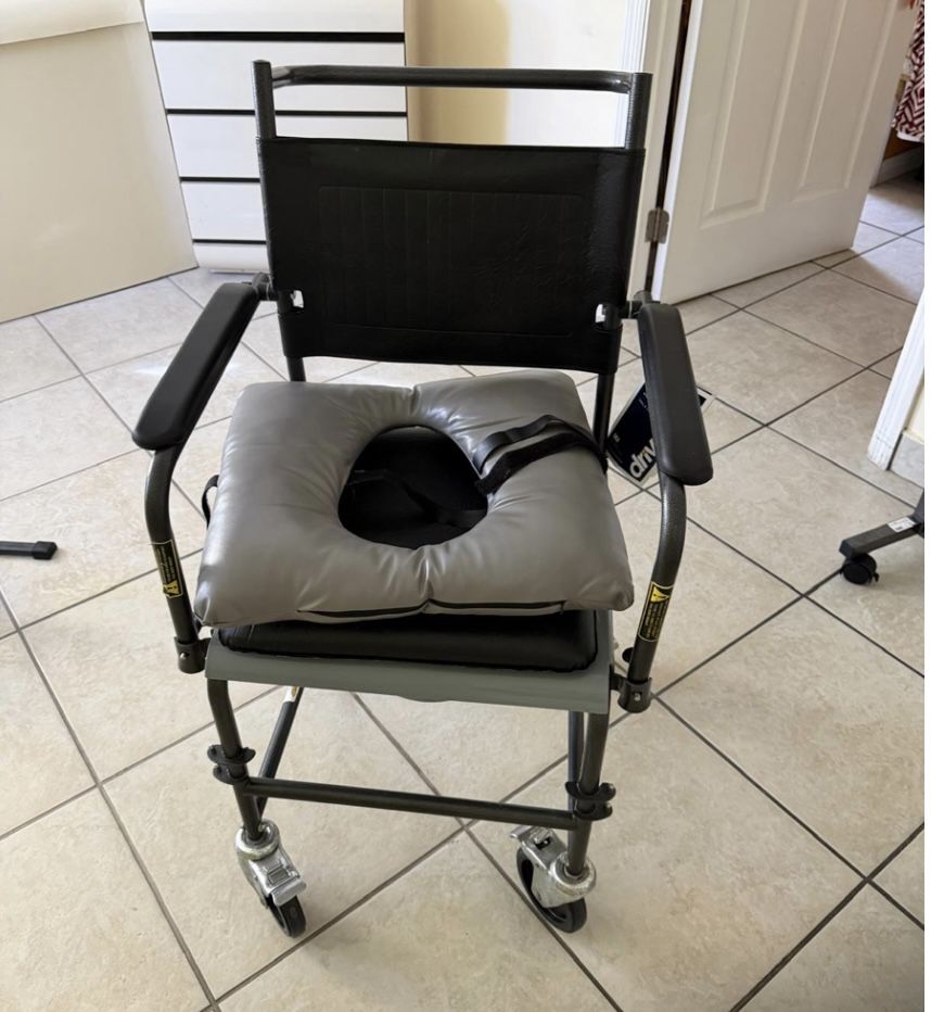 Wheelchair with commode. Also a cushion around the commode. Original cost or cushion $50.007