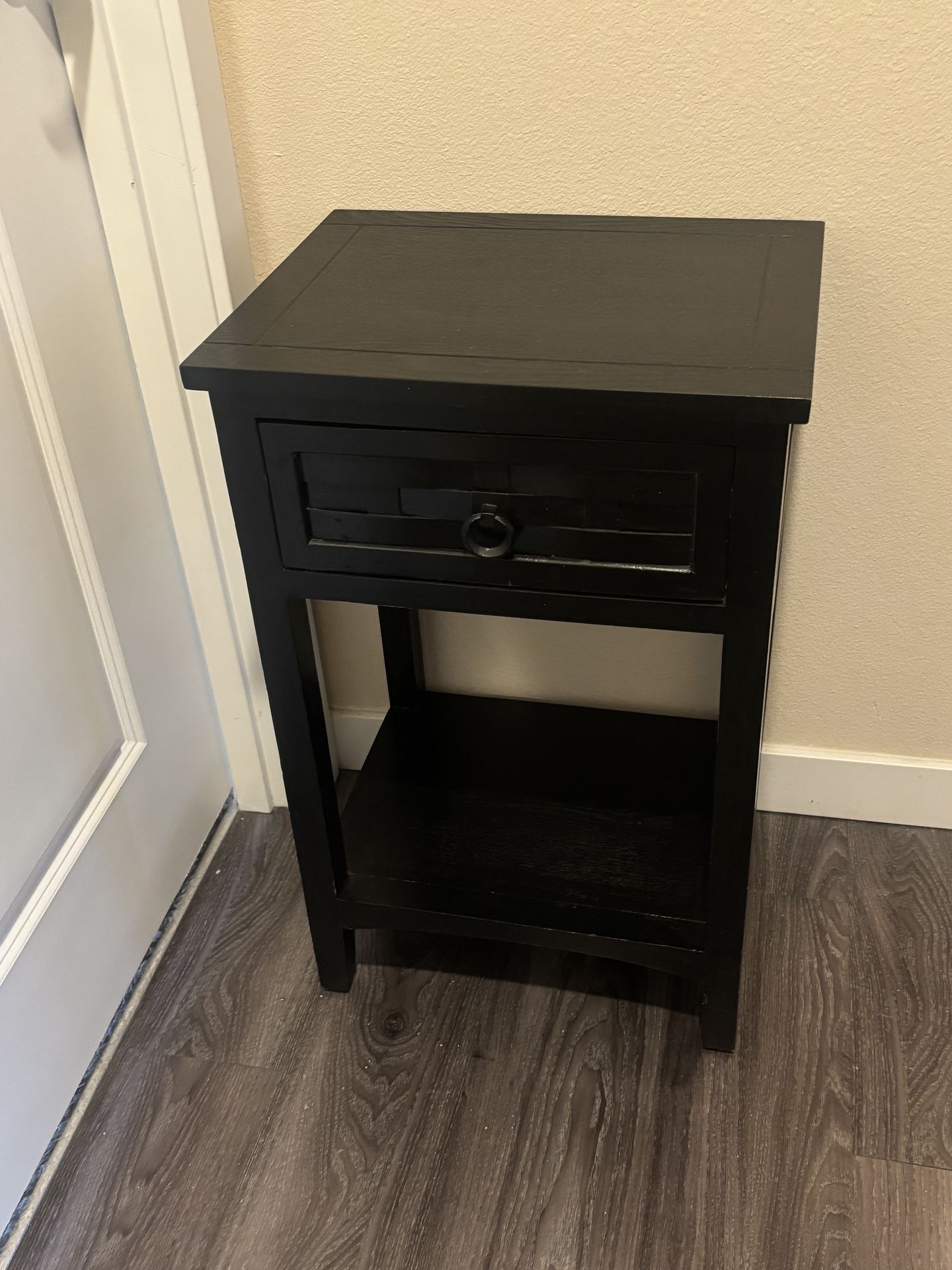 Black bedside table has a little crack on the left side.- but it doesn't affect the work and isn't felt .See last photo Pick up and cash Vancouver East