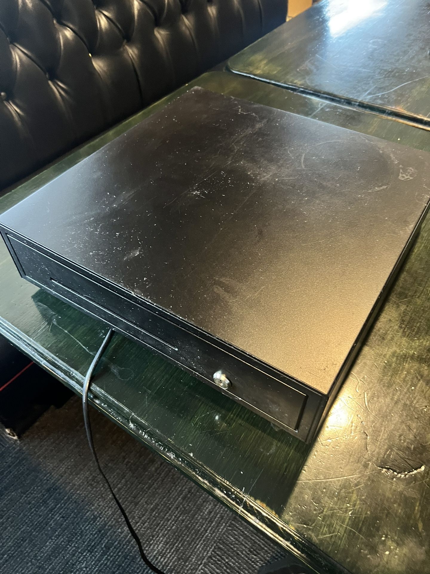 It is the standard size with 5 slots to insert money, can lift inside drawer to put large bills underneath. If you need dimensions, I can measure upon request Pick up in Seattle, Ballard area or Fed Way if needed.