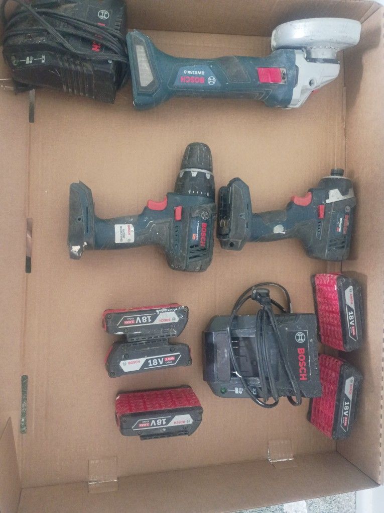 Bosch tool set in great condition 1 grinder 1 impact 1 drill 2 fast chargers 5 batteries $160