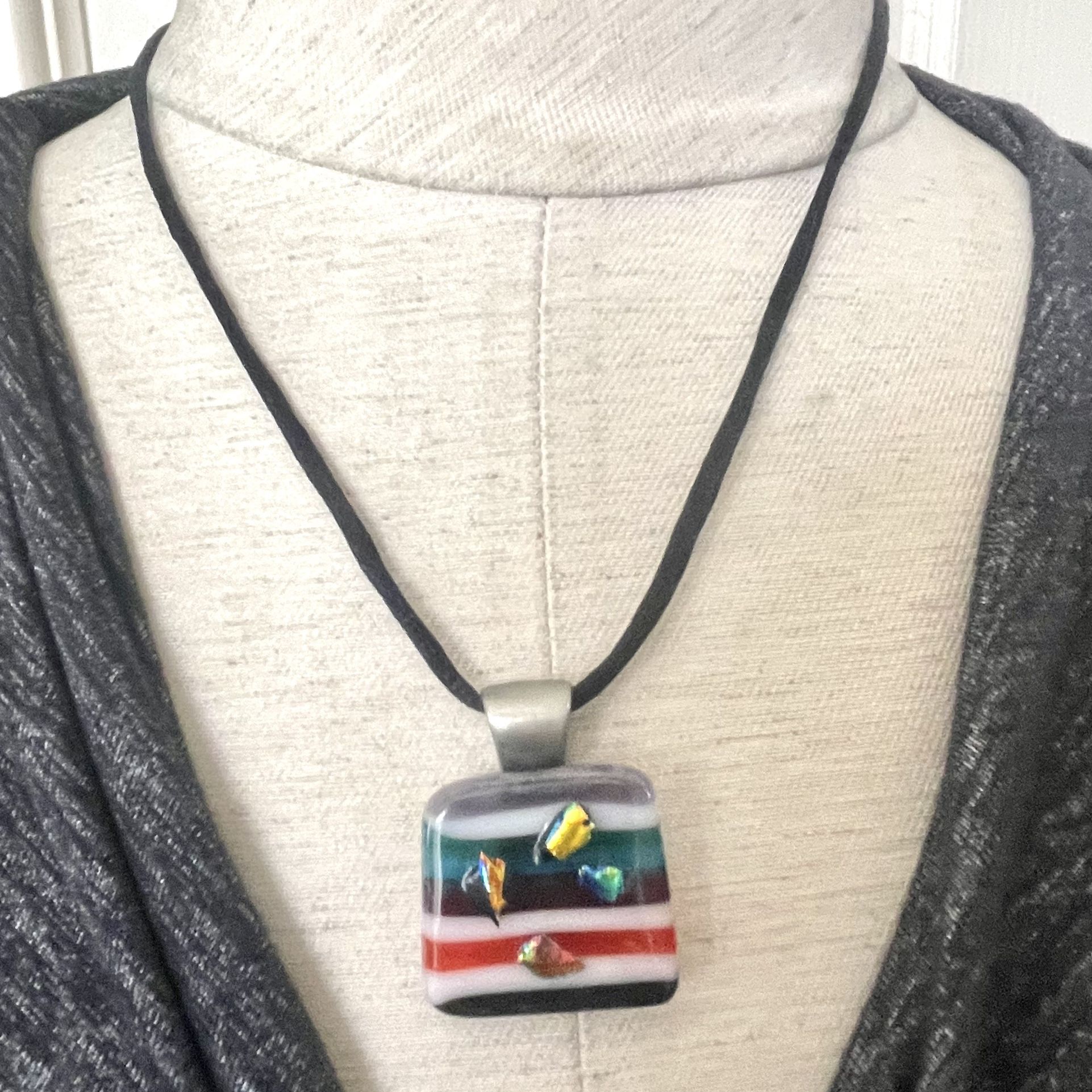 Glass pendant necklace On cord Lobster clasp Striped pendant with colorful chips Silver tone Very pretty Perfect every day piece Always open to reasonable offers Fast shipping Smoke and pet free home Bundle to save (the more you buy the bigger the discount ) Please see photos for details (they are part of the description) Happy to answer any questions Thanks for stopping by!