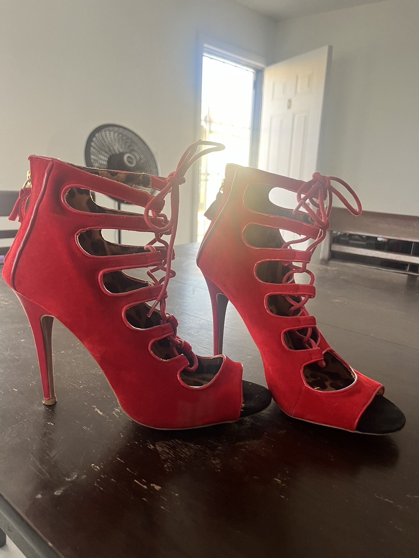 Suede/velvet lace up open toed booties, leopard print on the inside. Very comfortable.. hardly worn, maybe five times tops.