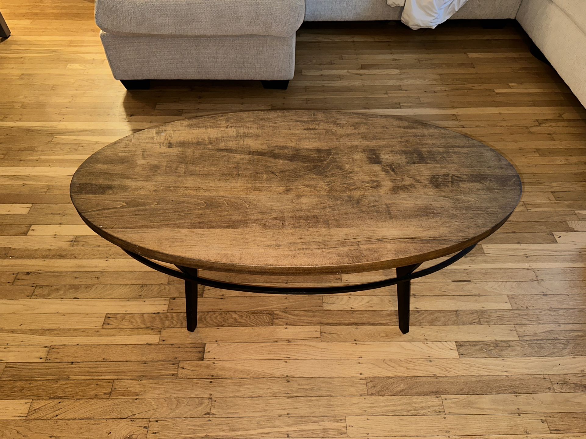 Beautiful solid wood coffee table. No damage, superior quality. Black metal legs Purchased for $600 originally.