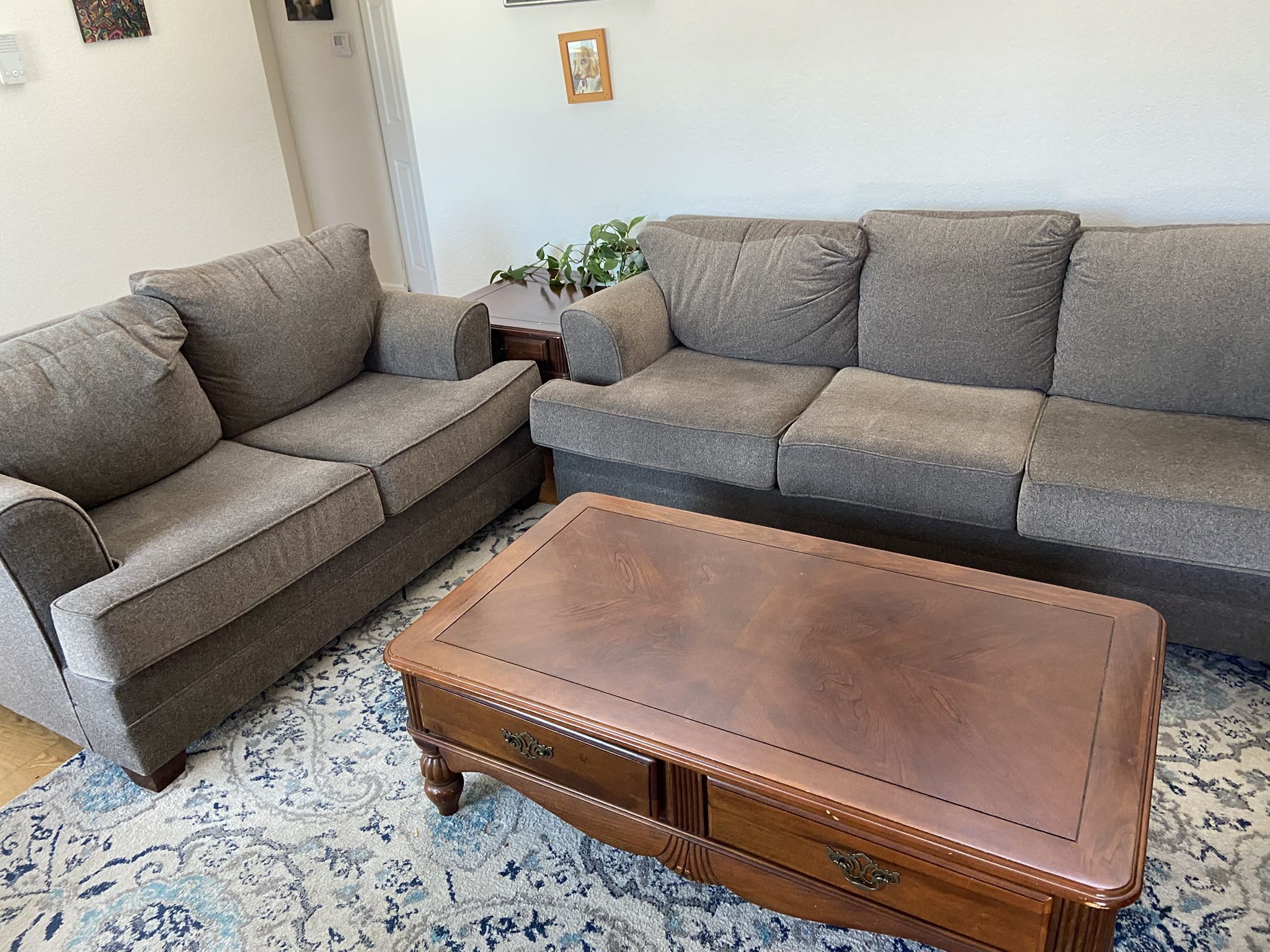 Matching gray couch and loveseat Dimensions: Couch 86“ x 36“ Loveseat 62 “ x 36 “ Couch and loveseat are in excellent condition visually (no tears or visible stains). However, there may be residue of dog urine in one or more of the pillows. My wife swears she can’t smell anything, but occasionally, when there is moisture in the air, I think there might be something. (Our dog passed of kidney disease in October.)