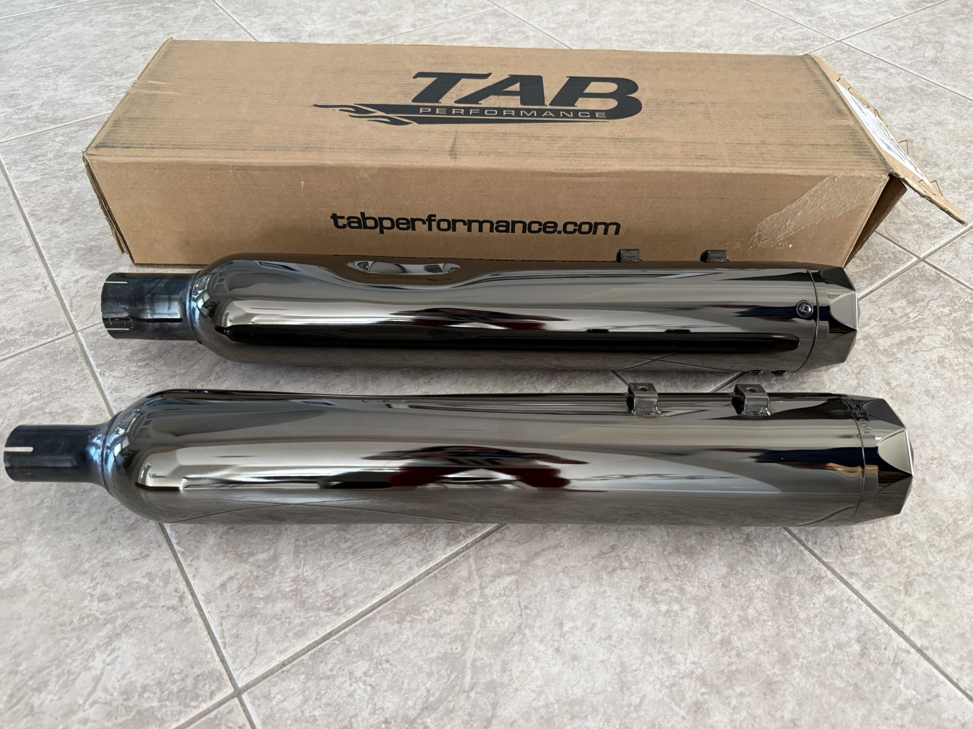 TAB Performance 4.5" B.A.M. (Bad Ass Mufflers) Stick Slip-On Mufflers. These mufflers are specifically designed for Harley-Davidson touring models, including CVO versions. Product Details: Brand: TAB Performance Model: 4.5" B.A.M. Stick Slip-On Mufflers Finish: The mufflers in the image appear to have a dark, reflective "Torched Chrome" or "Eclipse" finish. Compatibility: Designed for Harley-Davidson Milwaukee-Eight (M8) Touring models from 2017 to present. They are also compatible with stock CVO muffler heat shields. Key Features: These slip-ons feature a 4.5-inch diameter body and a tip-compatible design, allowing for various end cap styles and baffle options, such as the "Zombie" baffle. They are known for providing a rich, deep, and throaty tone. Used for 300 miles. No scratches and in perfect condition. Pick up in West Miramar by Dykes Road and I-75.