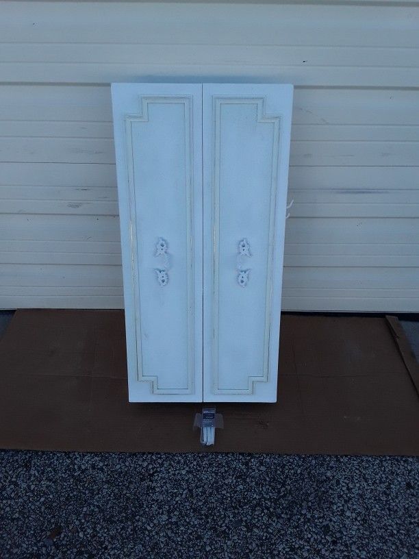 I have one old-fashioned white double door medicine cabinet with New Hardware and 36" Tall X 18" Wide and Like New Condition. $85.00