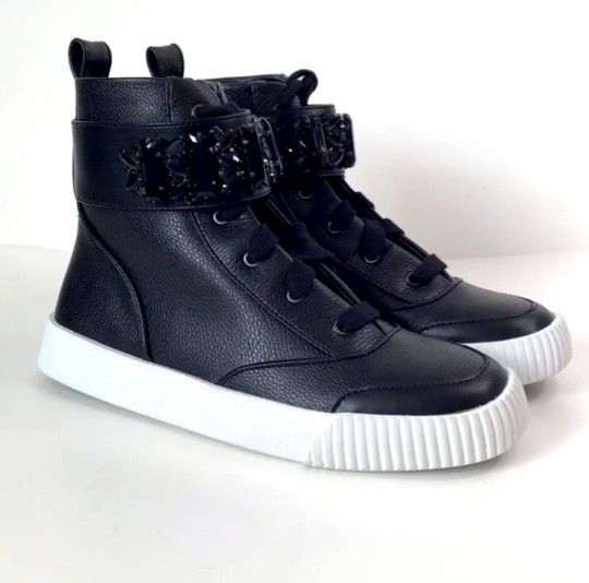 Gently worn Karl Lagerfeld fashion sneakers. Sparkling embellishments from the black gemstones (one missing) add a glam edge to the durable luxury sneakers. Dress them up or keep casual and they're equally stylish either way. Shoes come exactly as pictured with minimal wear. Leather upper Round toe Side zip closure; missing original laces Leather lined cushioned footbed Rubber sole Smoke and pet free home