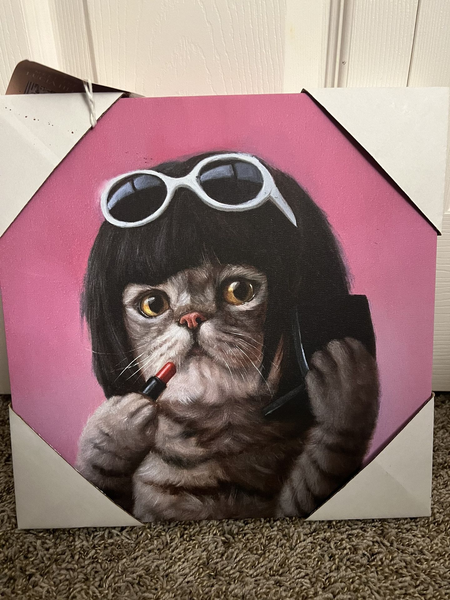 New with tags Funny cat wall art - cat with wig and sunglasses doing makeup. Asking $7. No trades. Has very small/minor paint splatter that was there when purchased. Barely noticeable on actual painting.