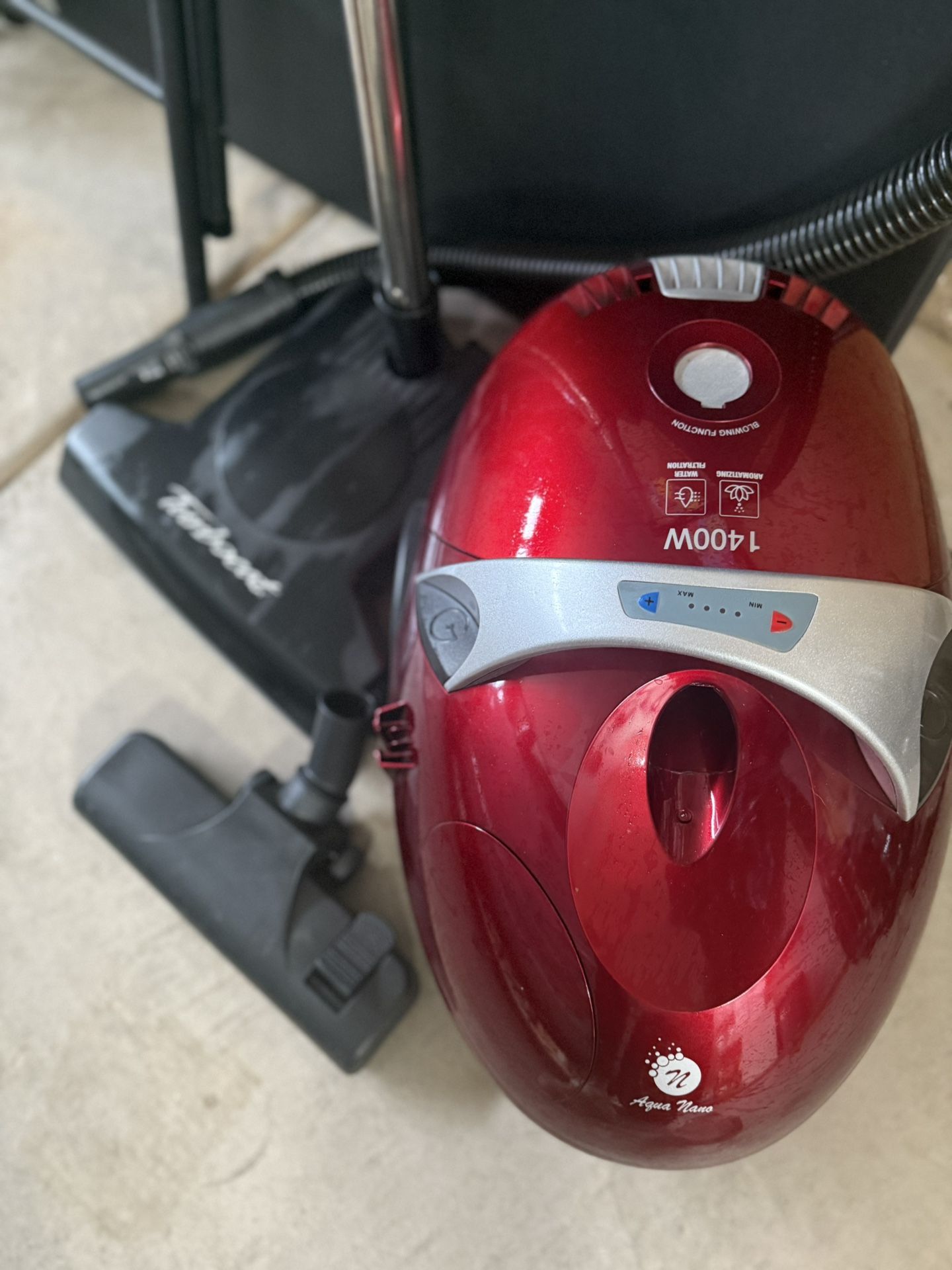 Vacuum cleaner that has water filtration to catch all the dust and hair . 4 different speed control levels. Made by Aqua King Cleans carpets, tiles, rugs all really well. Also cleans your air as an air filter.