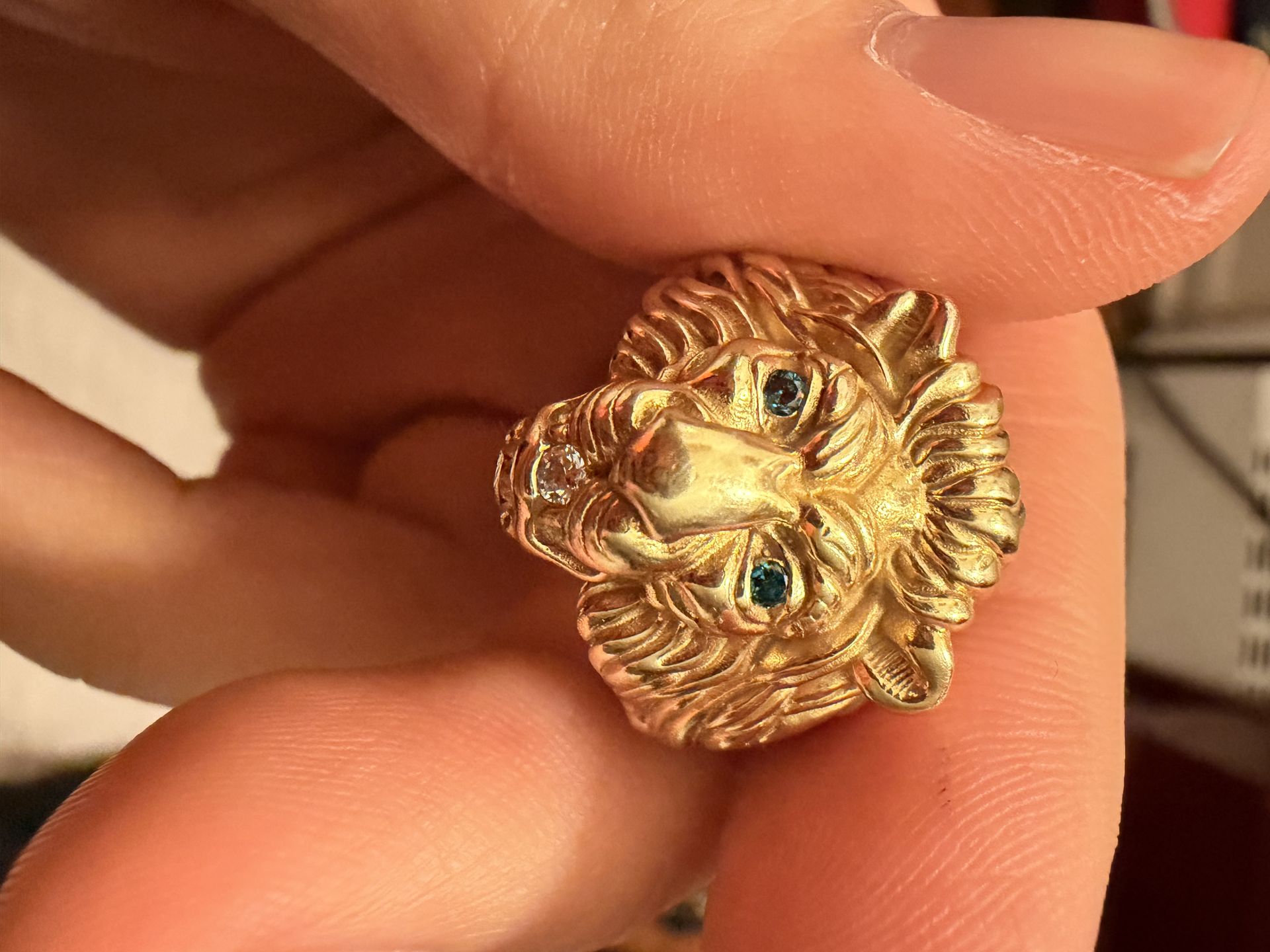 14k gold lion ring Weighs 14.6 grams Size 10.5 Asking 1550 obo Diamond eyes and mouth .25