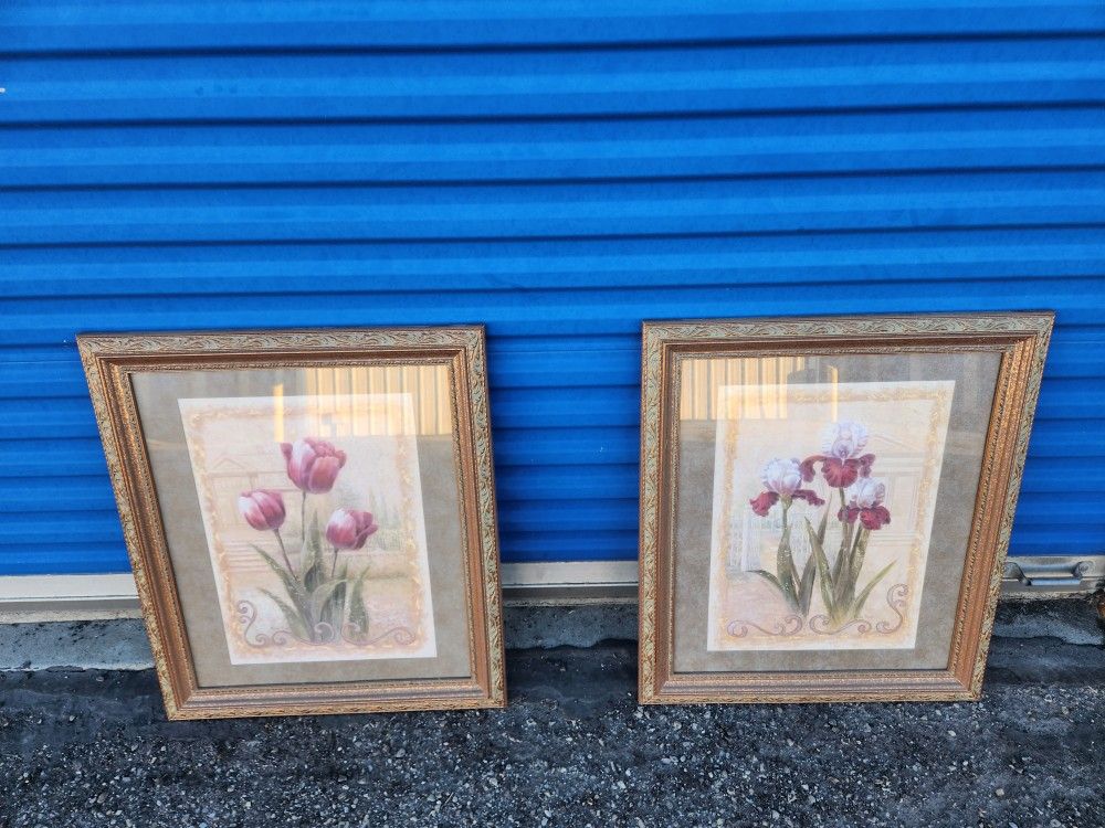 Home Interior framed print featuring irises, likely part of a set. The prints are often associated with the artist Vivian Flasch. Product Information Artwork Subject: The art print depicts a still life of irises with a detailed, gold-toned frame. Brand/Maker: These specific prints were often sold by the company Home Interiors & Gifts. Condition/Frame: The example from search results appears to use a "Syroco Plastic Frame" designed to look like wood, which was a common feature for mass-produced decorative art of this style. Size 28.5" tall 24.5" wide .75" thick 2/2/26 7018