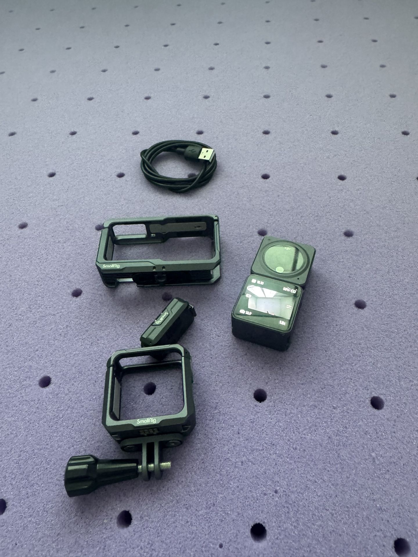 • DJI Action 2 camera unit • Front touchscreen/battery module • SmallRig full cage • SmallRig magnetic mount • SmallRig frame with GoPro-style mount • USB-C cable
