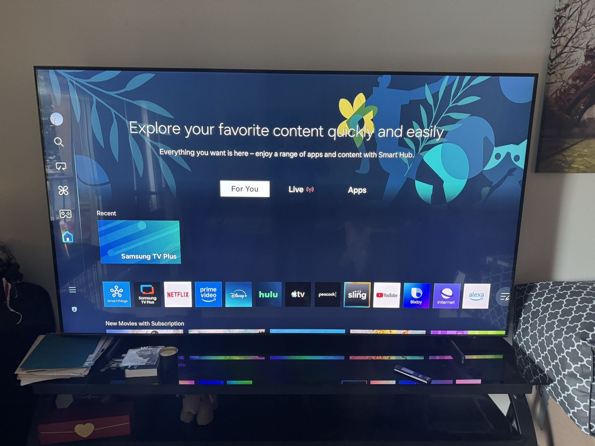 Voice activated remote it even still has the plastic over that screen because it’s that new. I haven’t even removed it. It was only turned on a few times ! And the glass 3 shelf stand it sits on . I don’t want to sell it, but due to something tragic I have to move out of the country. Come get it before December 25. I’m leaving the 26th in the morning.