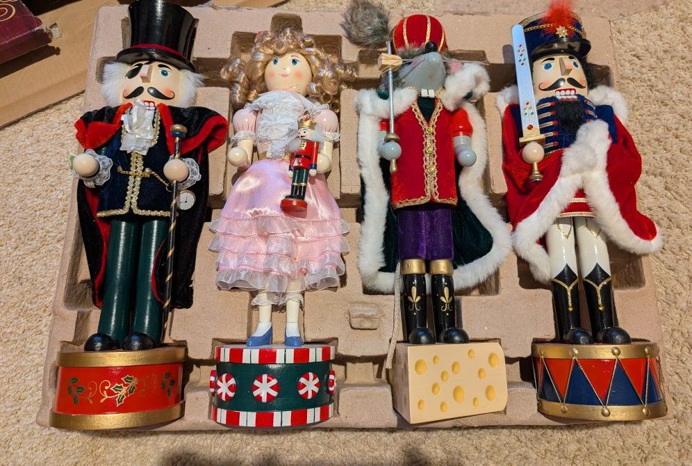 Beautiful Nutcracker Suite decoration. Like new! Clara adorned in her pink dress, holding a toy nutcracker and standing on a peppermint candy pedestal. Mouse king ( one ear came off but easily glued back on) standing on a wedge of cheese and two well dressed, with attention to detail nutcrackers. This set has always been stored in its original box. Makes a wonderful addition to your holiday decor. Will add measurements later but each approx 12" tall