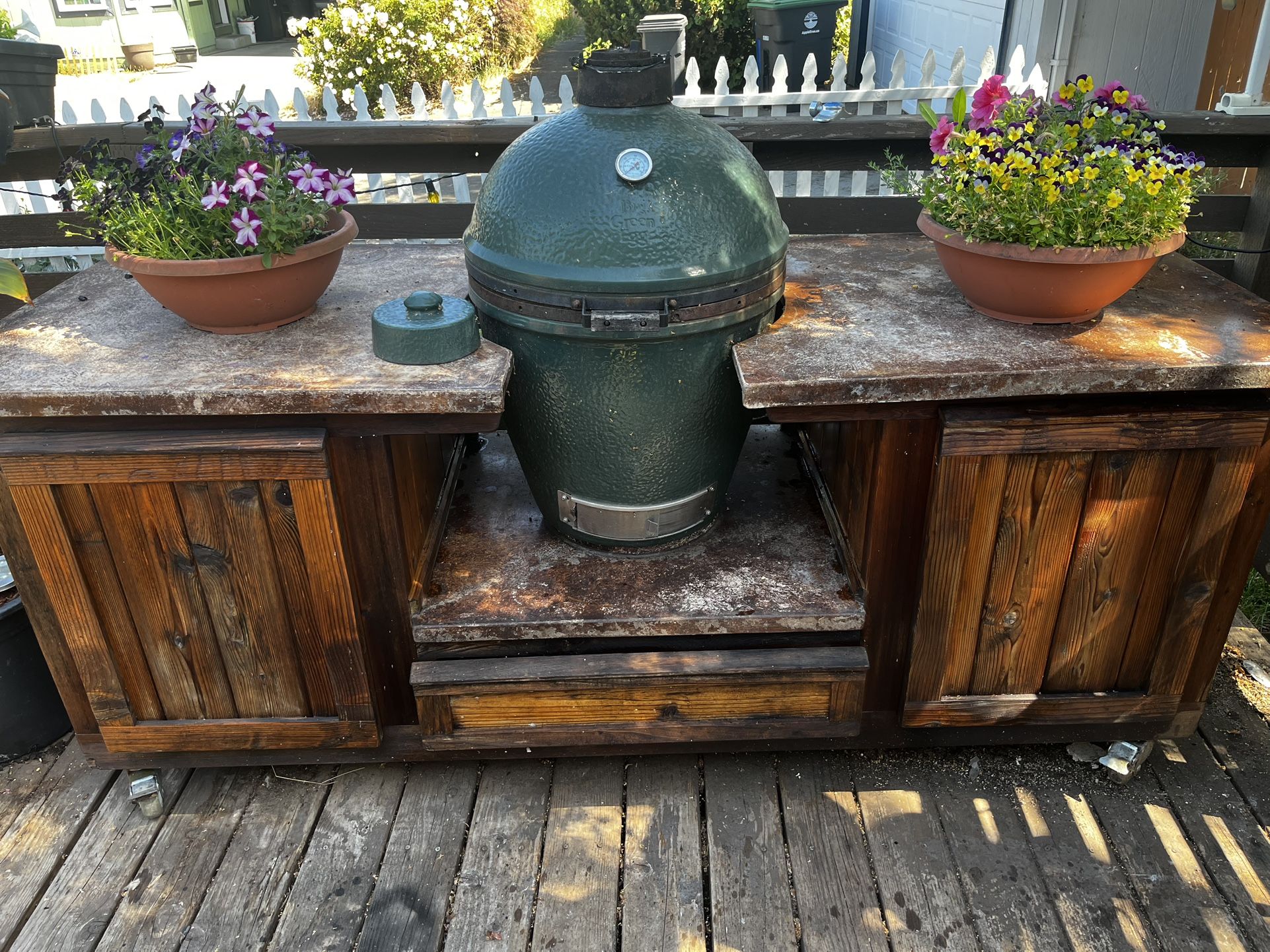I have a large Big Green Egg I’d like to sell. It is all cleaned out and ready to cook. The cook station has two cabinets and 1 drawer. It’s on wheels for easy moving and it comes with a pizza stone that can be used for other things and a fan powered coal starter. $900 OBO