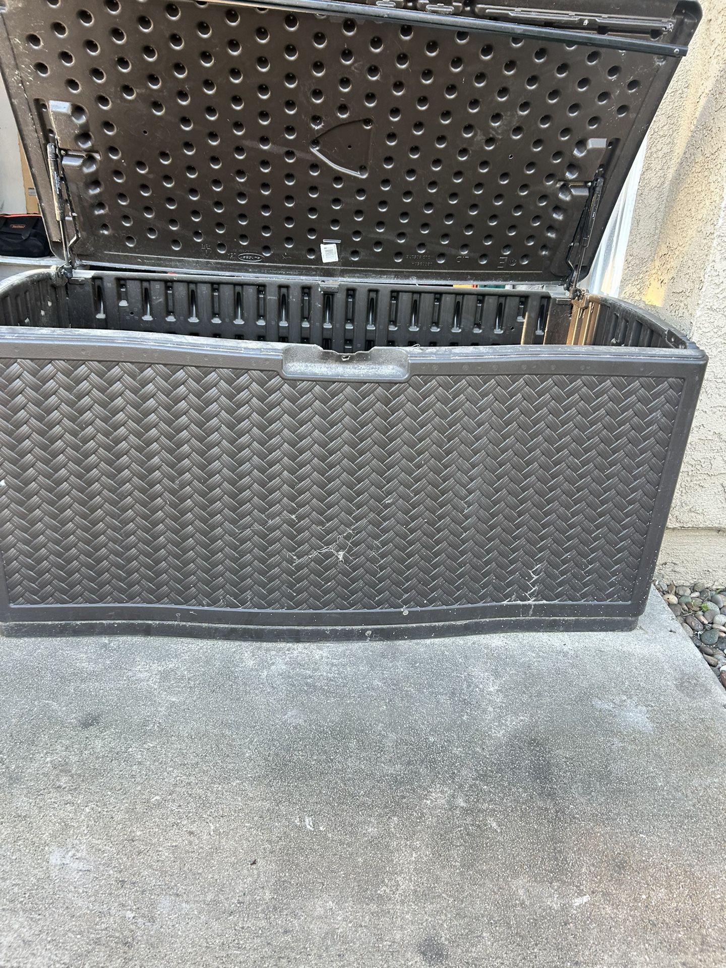 Outdoor Brown Suncast Storage Box - $75 Durable resin construction, weather-resistant. Perfect for patio cushions, pool toys, garden tools, or outdoor equipment. Keeps contents dry and protected. Ready for pickup near McKinley and Promenade.