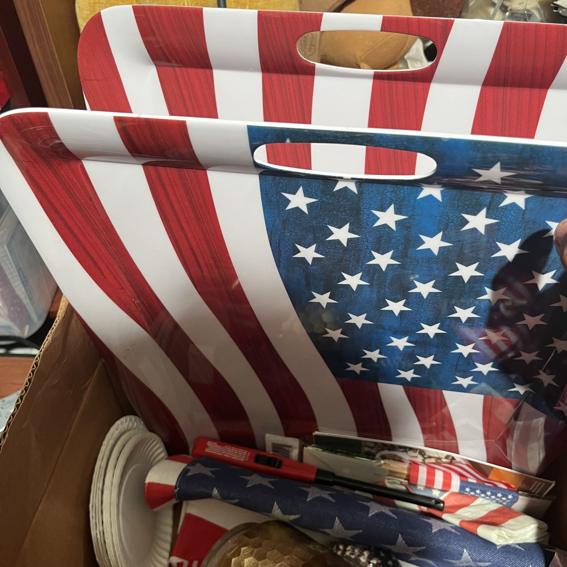 Patriotic décor lot with American flag themed party items. Includes trays, flags, table décor, and accessories. Great for parties, events, or seasonal decorating. Condition: Mixed (used & new) Selling everything together. Local pickup preferred.