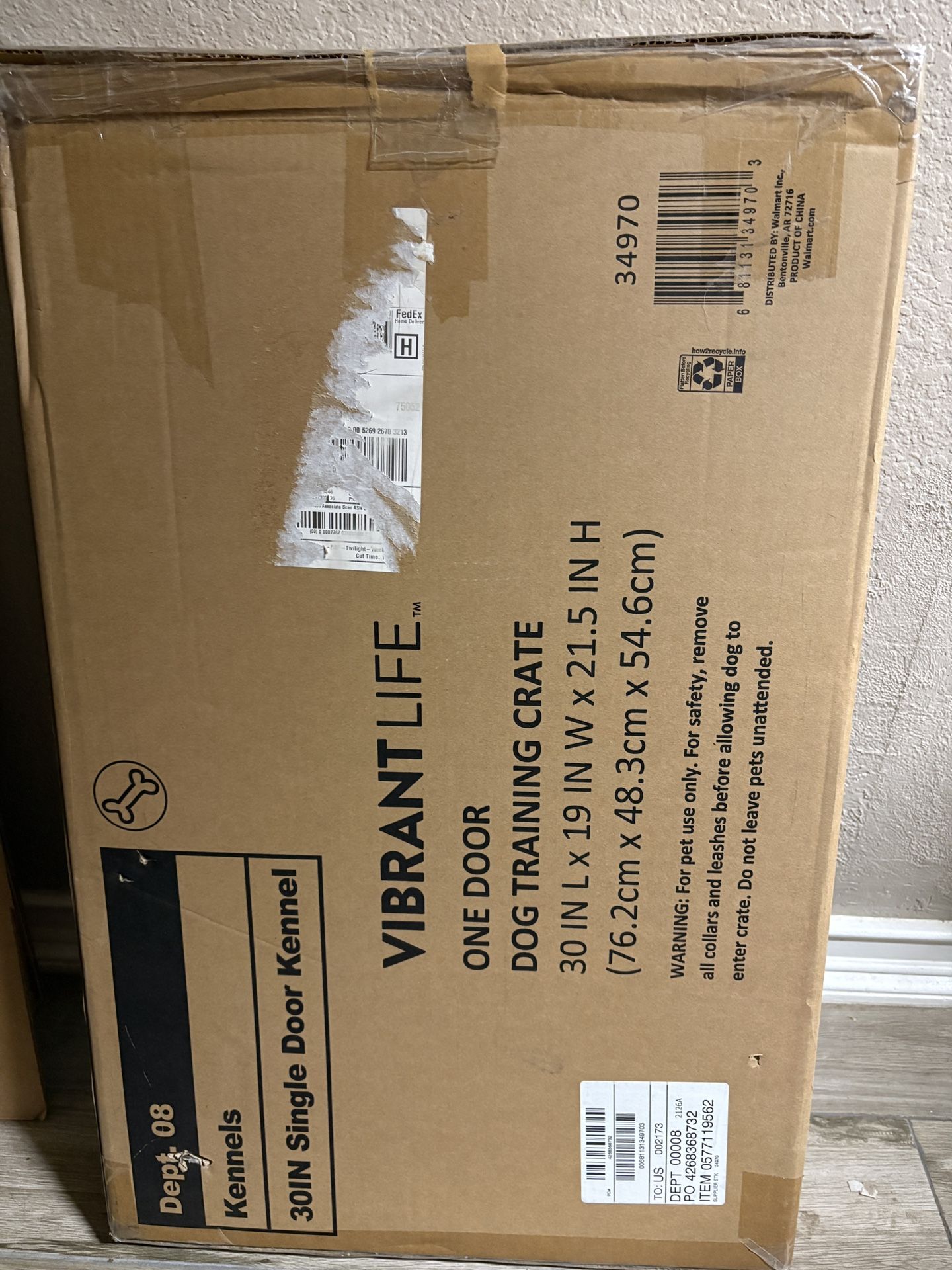 Small dog training crate. Used but in good condition. You can see the measurements on the box.