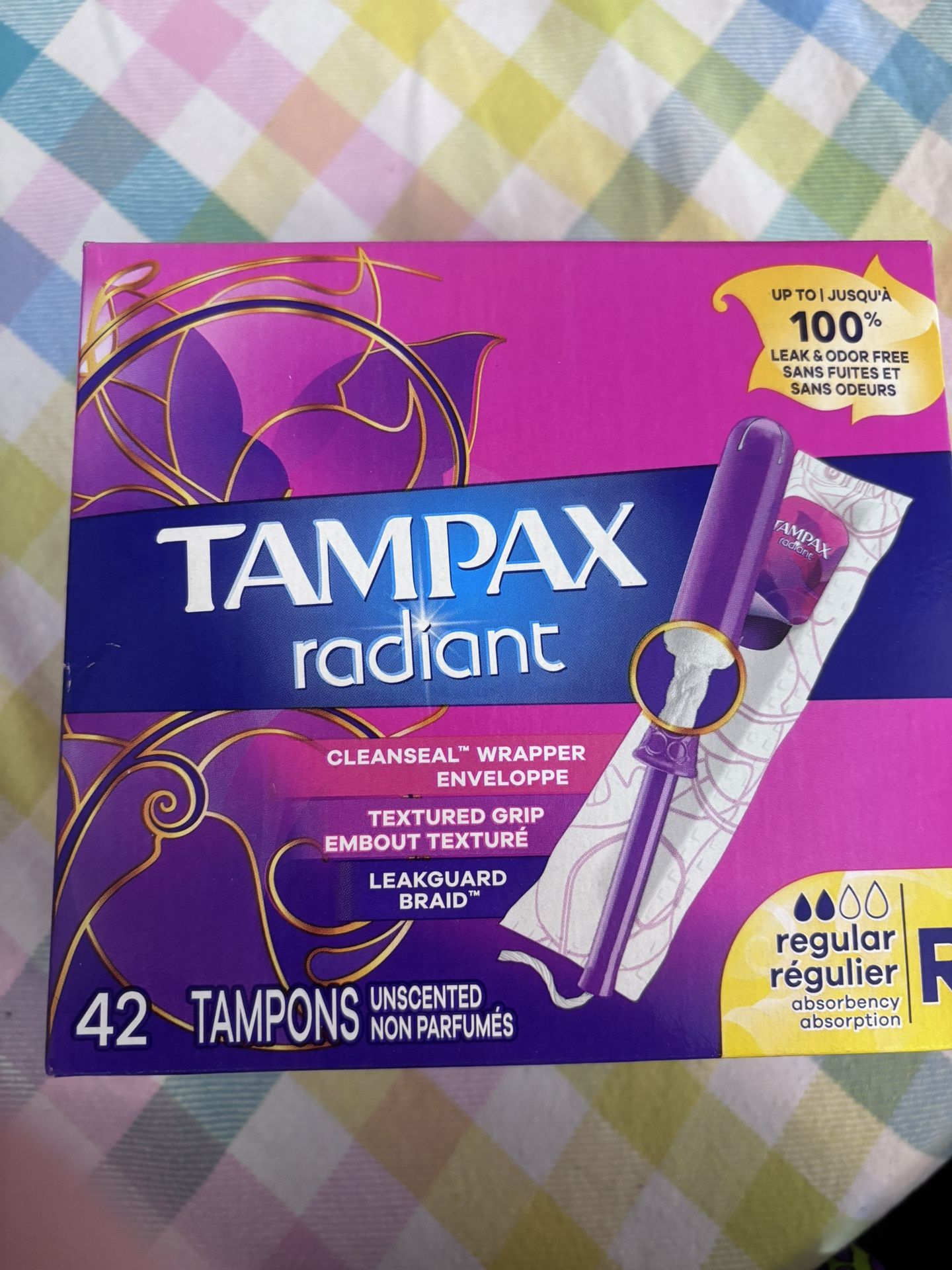 New box of Tampax Radiant tampons. Has 42 regular absorbency tampons, unscented. Sealed box