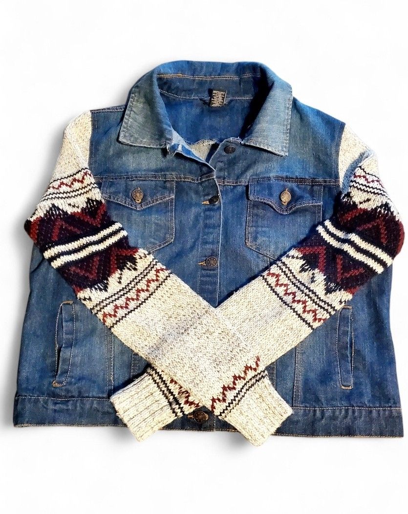 Rue21 denim jacket with knit sweater sleeves. Style: Denim jacket with knit or cloth sleeves. Material: 90% cotton and 10% Polyester blend denim for the body. Size XL Stock # SP08