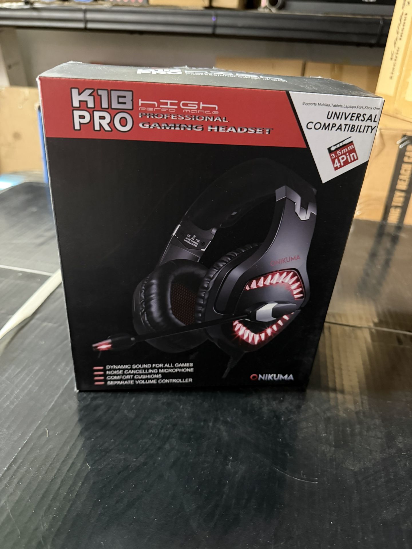ONIKUMA K1B Pro Gaming Headset. This headset is brand new in box. Universal compatible with PS4, Xbox One, PC, laptops, tablets, mobile phones. Has 3.5mm 4-pin connector. Dynamic sound. Noise cancelling microphone. Comfort cushions. Separate volume controller. LED indicator light.