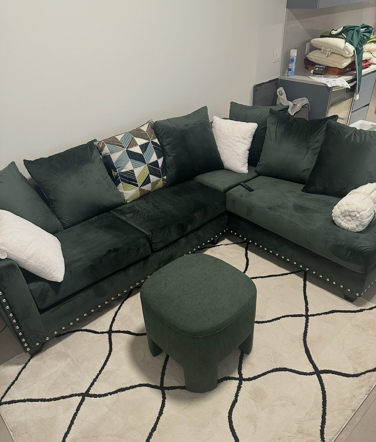 Fairly new (bought in June 2025) L-Shaped sectional couch. Originally purchased for $700 (Coco Furniture Store). All green pillows included. If you want the ottoman, you’re more than welcome. *Couch is in storage in Wynwood* *No delivery* *Rug not included* *White pillows not included*
