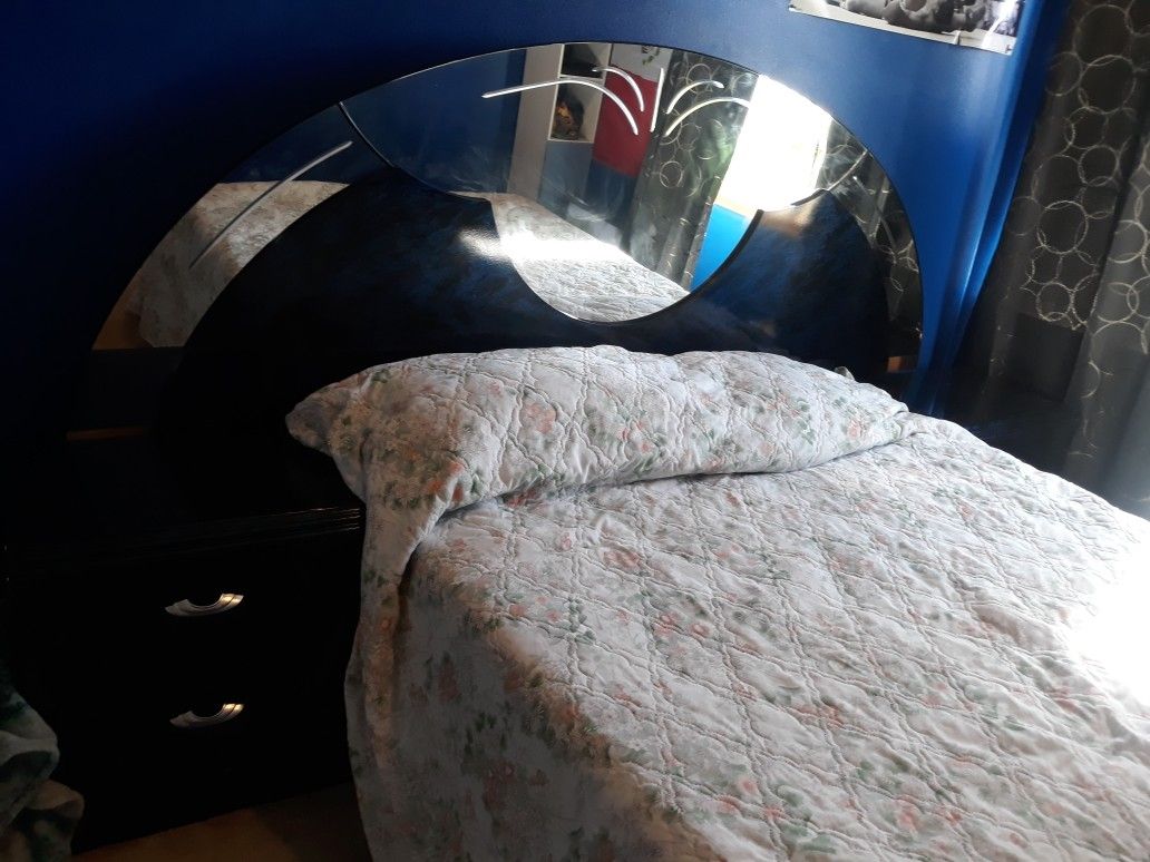 Nice bedroom set , dresser 2 night stands, and bed frame w nice mirrors, fits diferent sizes of matress