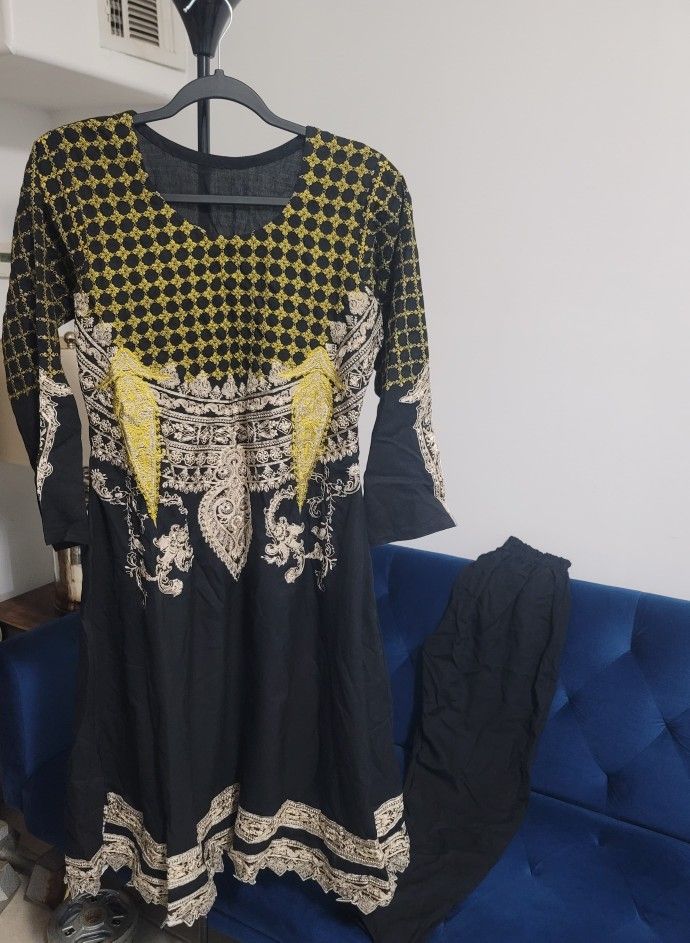 Elegant black dress with gold embroidery and matching pants and dopata